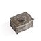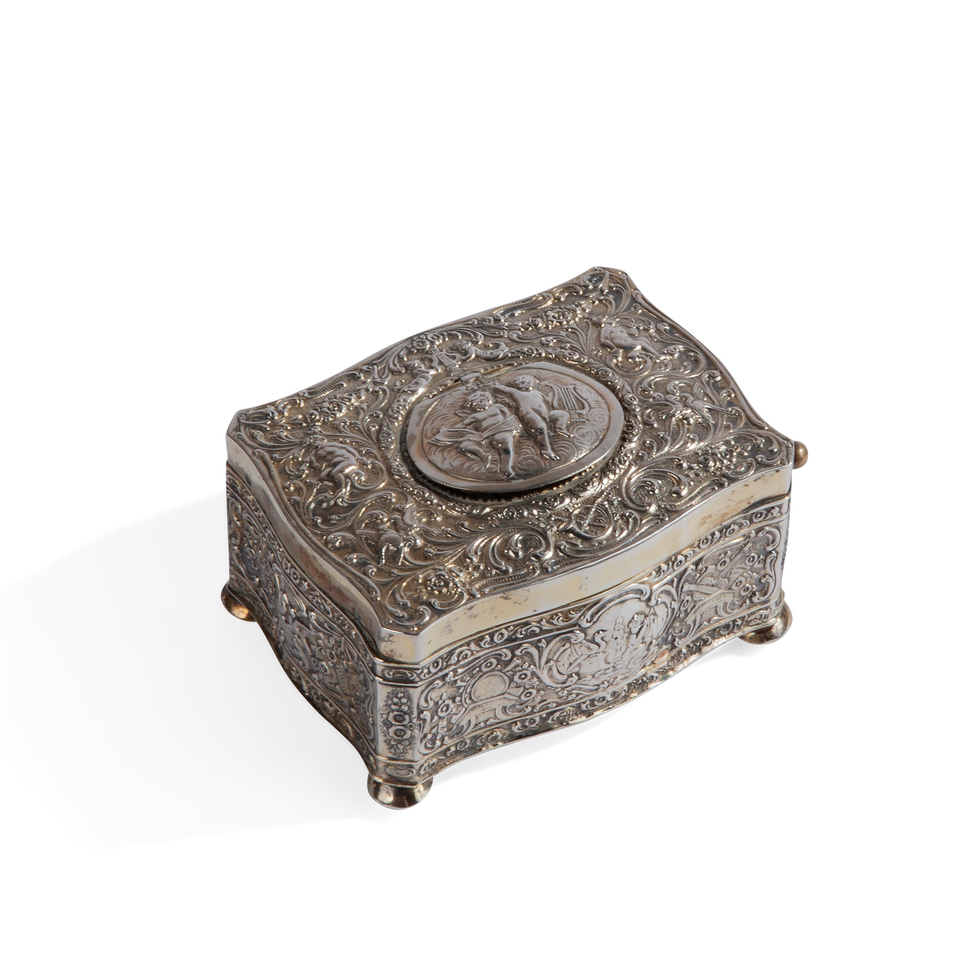 Boite à musique in argento sterling con automa canoro, Germania, seconda metà del XIX secolo, con fitta ornamentazione sbalzata a volute, motivi vegetali e fiori; di forma rettangolare, reca sulla sommità uno sportellino ovale lievemente convesso decorato da figure di putti musicanti e cela all'interno un uccellino meccanico. Non funzionante