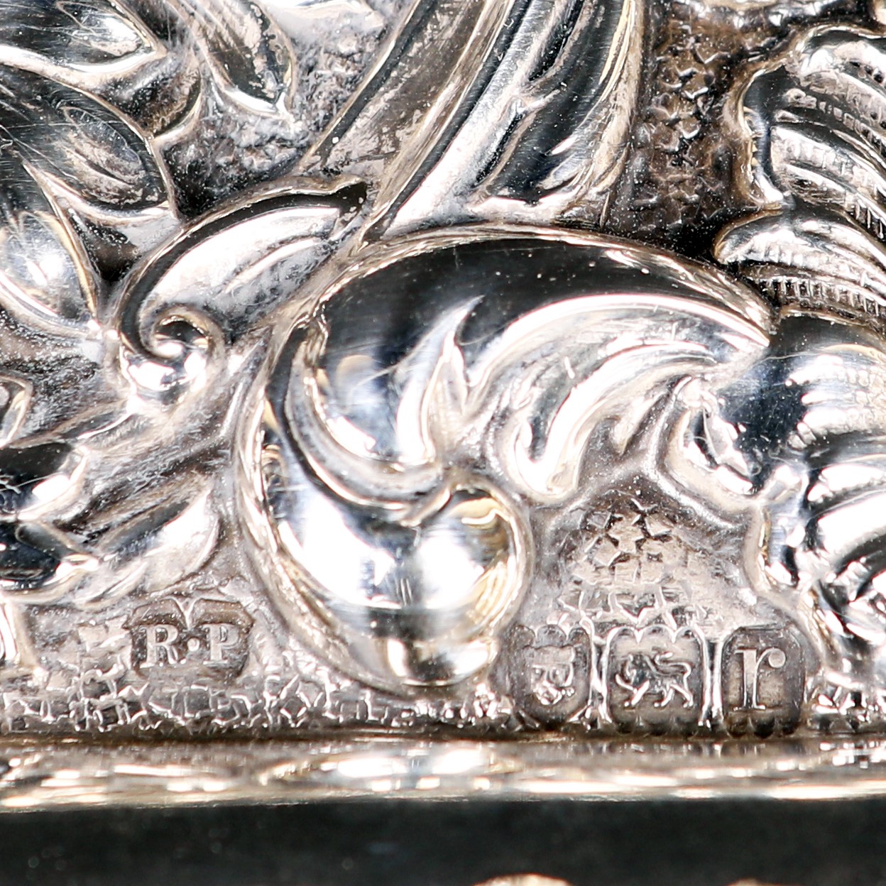 Vassoio in argento 925/1000 sbalzato e cesellato, Londra, 1912, argentiere R.P., cm 29,3x20,3 - gr. 331, di forma rettangolare ad angoli arrotondati e fitta ornamentazione a volute, motivi vegetali e fiori; al centro riserva ovale liscia per iscrizione