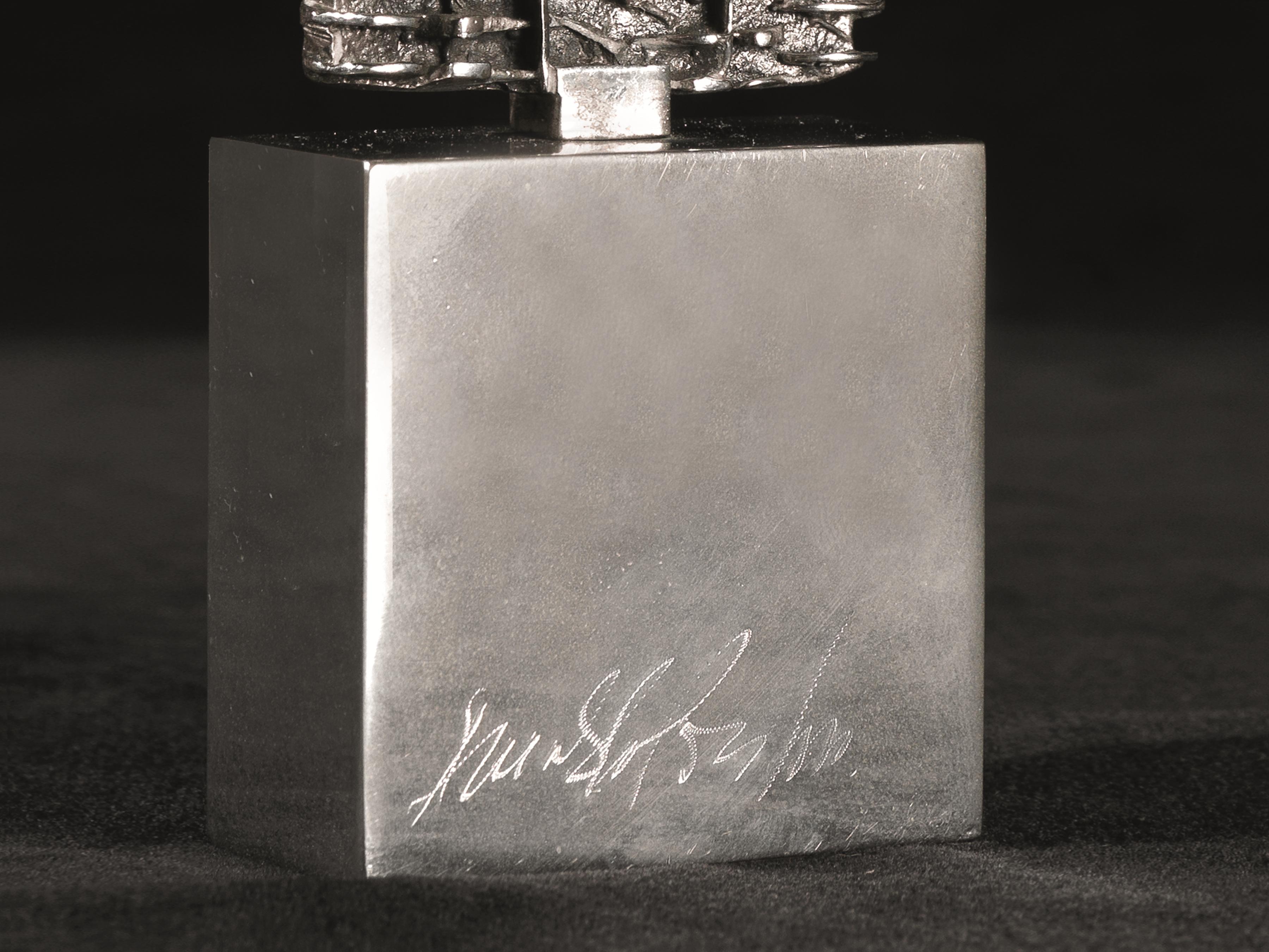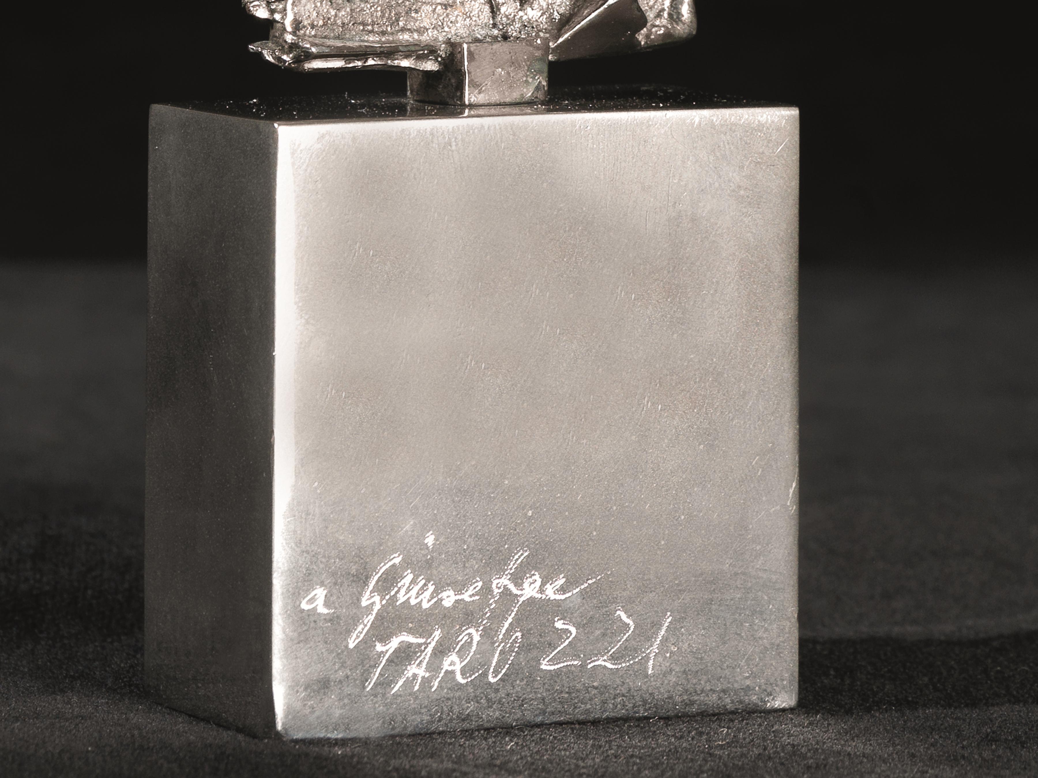 bronzo argentato su base in ottone cromato, cm 21x5x2,5; p.a.