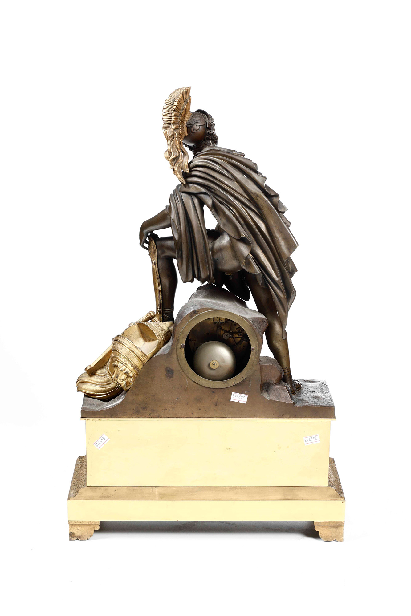 Pendola da tavolo in bronzo dorato e patinato, XIX secolo, con figura di Marte (?), quadrante smaltato a numerazione romana per le ore, W. 38 - D. 15 - H. 58 cm
