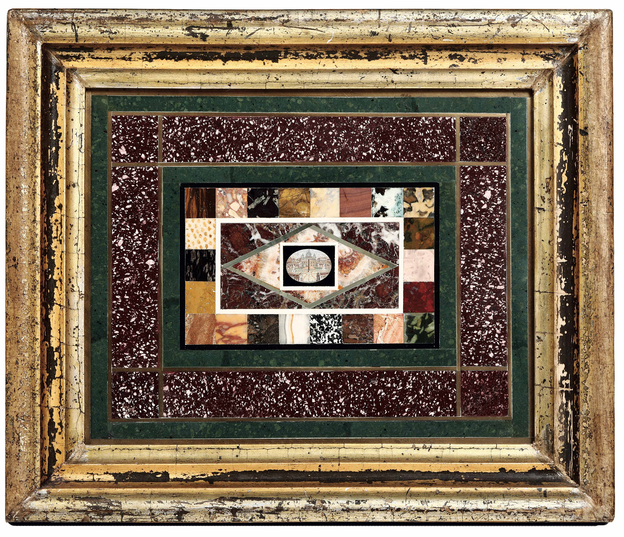Commesso di marmi su fondo in porfido e serpentino con al centro micromosaico raffigurante San Pietro. XX secolo