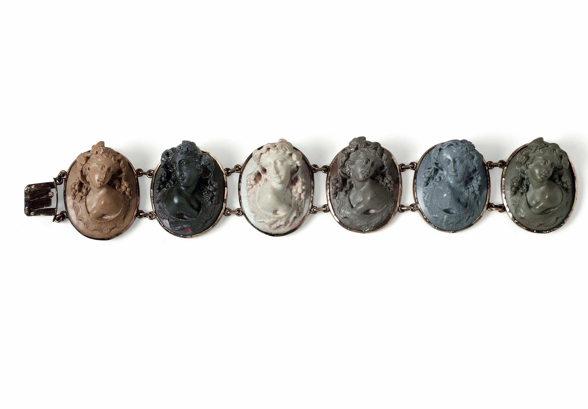 Bracciale con montatura in oro a basso titolo e inserti di protomi femminili in pietra lavica (?)
