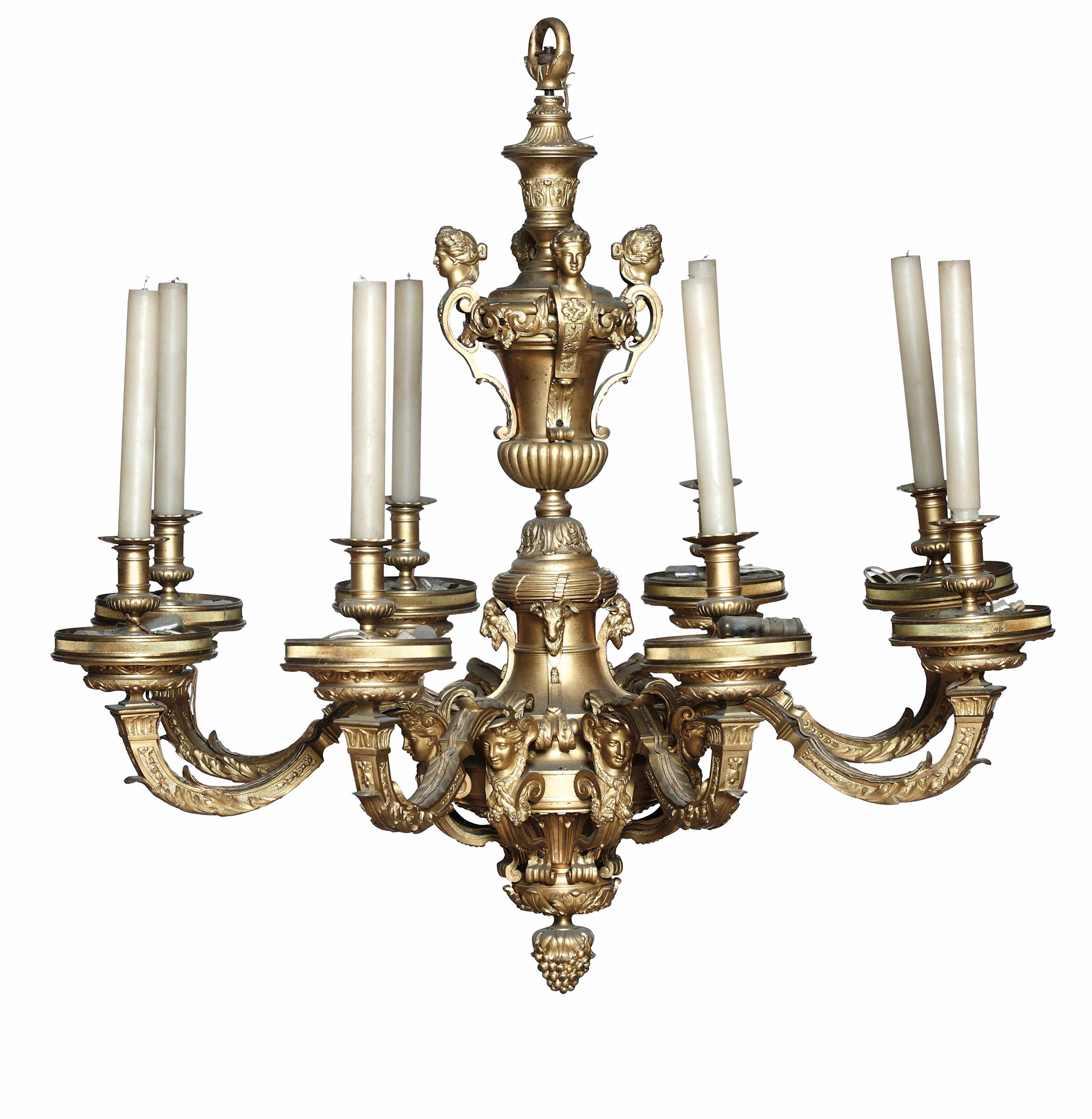 Lampadario a otto fiamme in bronzo dorato e cesellato. XIX-XX secolo, decorato con teste zoomorfe e antropomorfe, finale a grappolo d'uva, D. 80 - H. 80 Cm