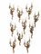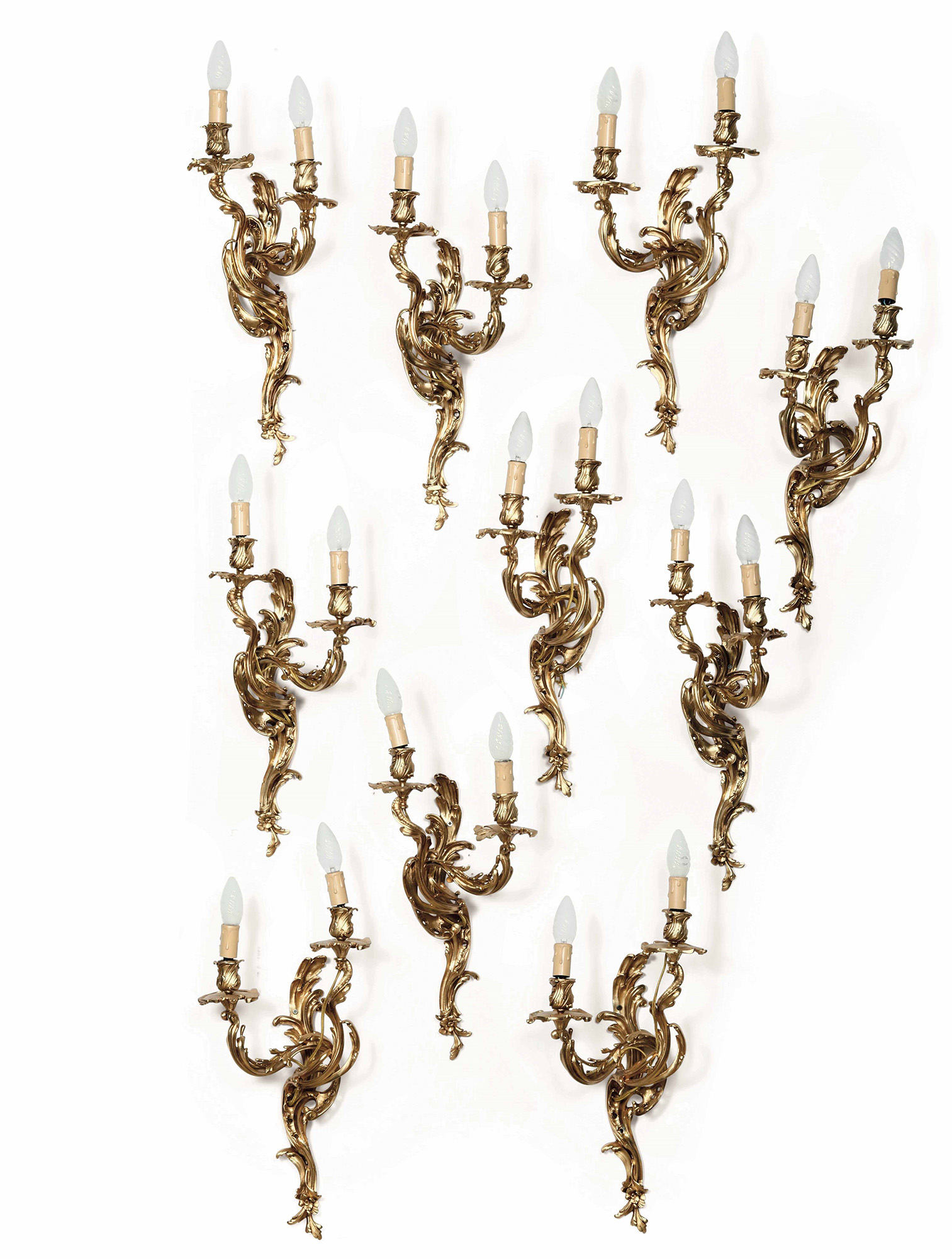Insieme di dieci appliques a due luci in bronzo dorato. XX secolo