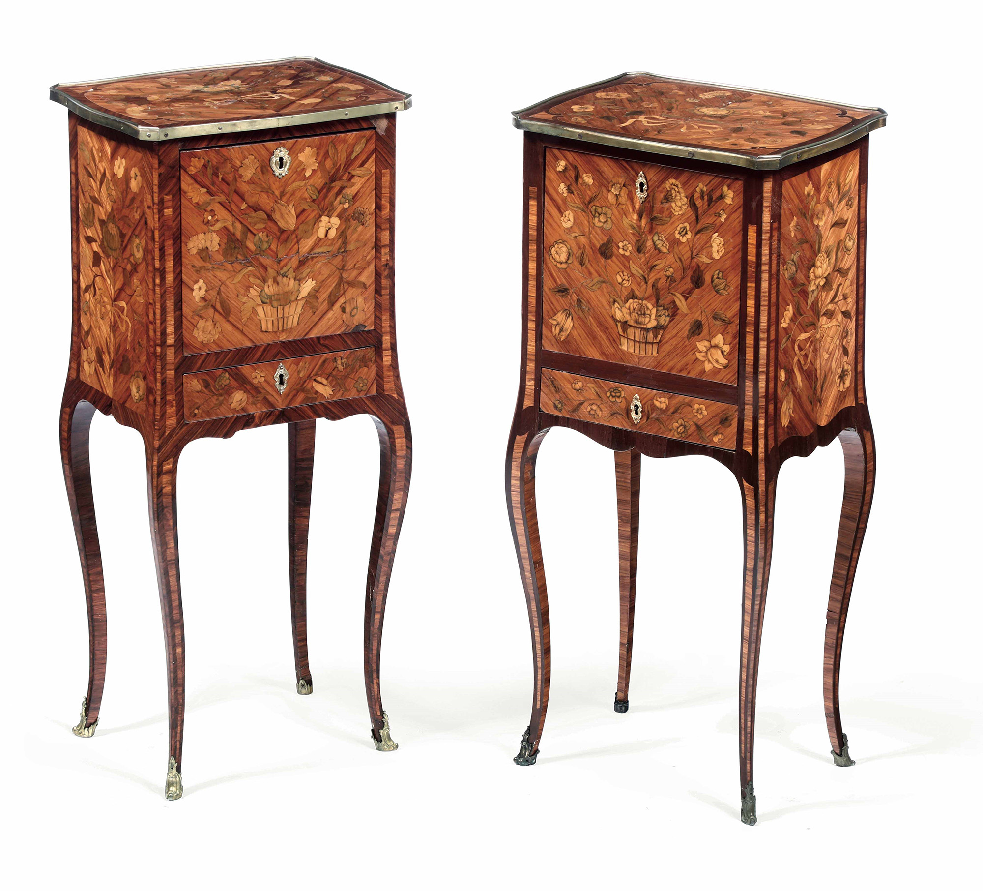 Coppia di comodini in legno lastronato ed intarsiato. Francia XVIII-XIX secolo, ricchi decori intarsiati a motivo floreale in varie essenze; un'anta ed un cassettino sul fronte, alte gambe arcuate, W. 44 - D. 35 - H. 95 Cm