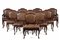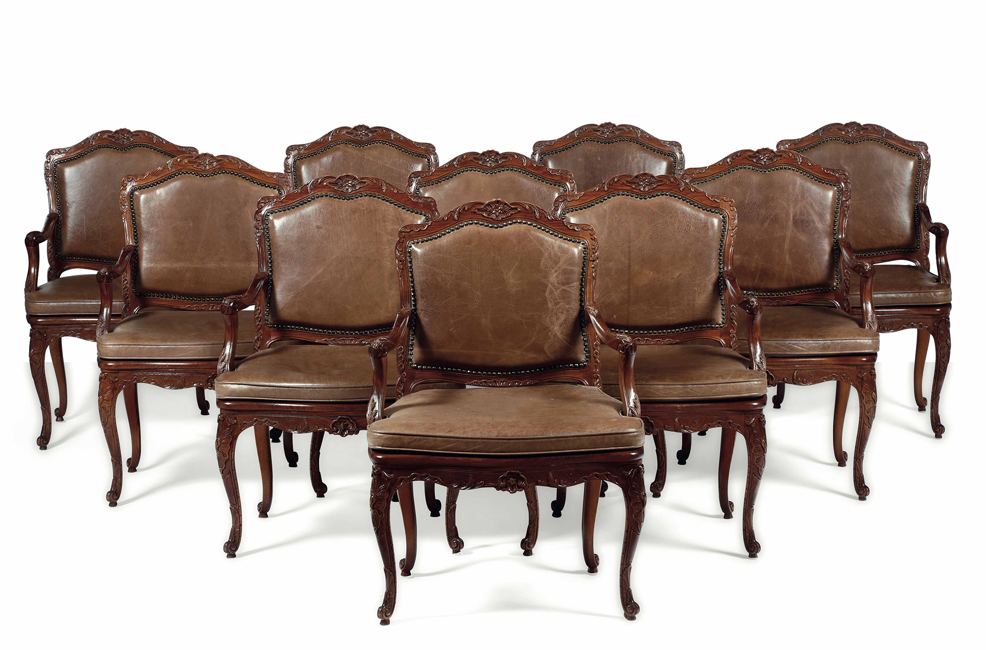 Dieci poltroncine in legno intagliato. XX secolo, decori intagliati a motivo fogliaceo e floreali, braccioli a ricciolo, gambe arcuate, W. 65 - D. 53 - H. 97 Cm
