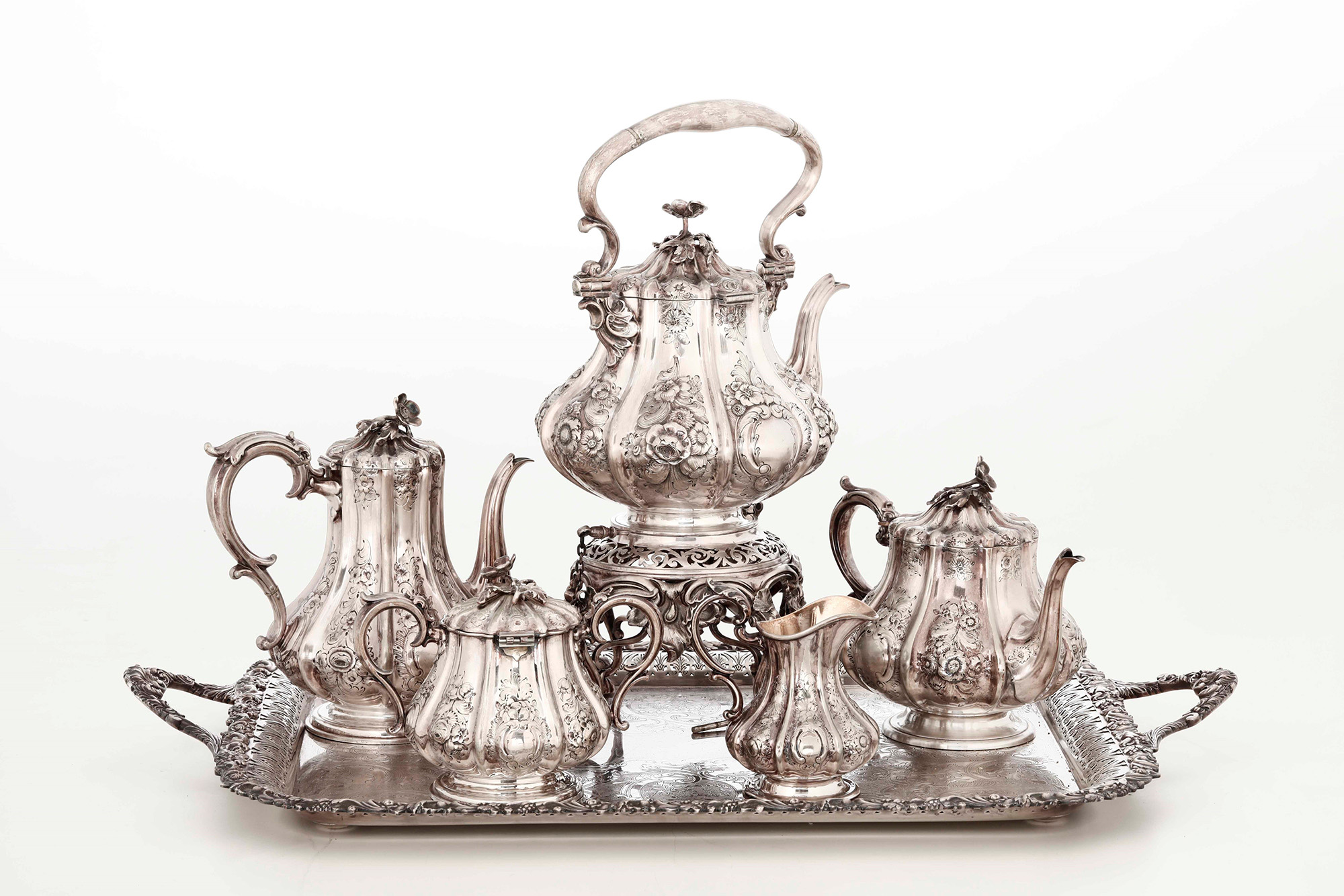 Servizio da tè e caffè in Sheffield, XX secolo, composto da caffettiera, teiera, lattiera, zuccheriera, samovar e vassoio