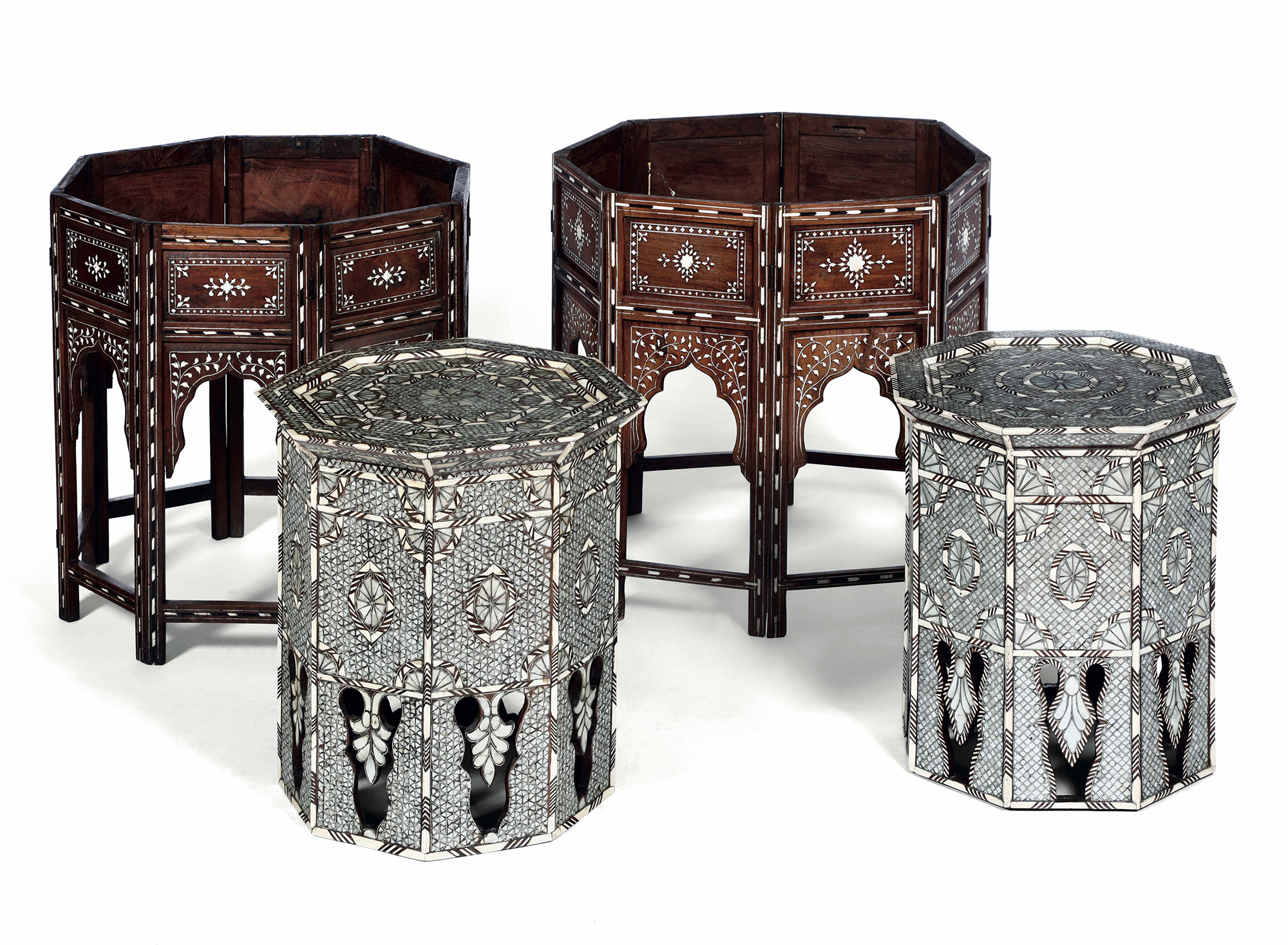 Lot 237 | Insieme di quattro tavolini bassi intarsiati in osso, madreperla e legni pregiati. Arte di gusto moresco XX secolo