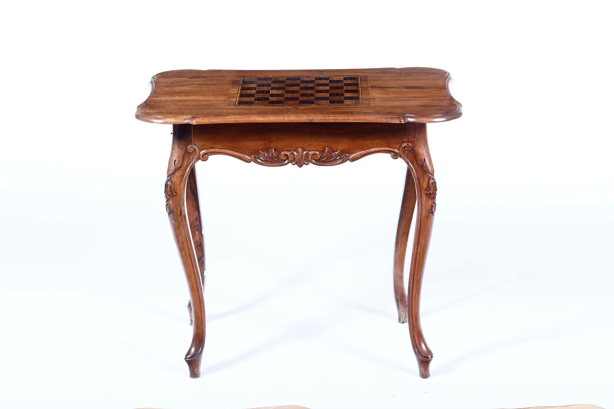 Tavolo da gioco in noce intagliato e intarsiato. XIX secolo, piano sagomato con intarsio centrale a scacchiera; gambe arcuate, W. 80 - D. 57 - H. 70 Cm