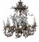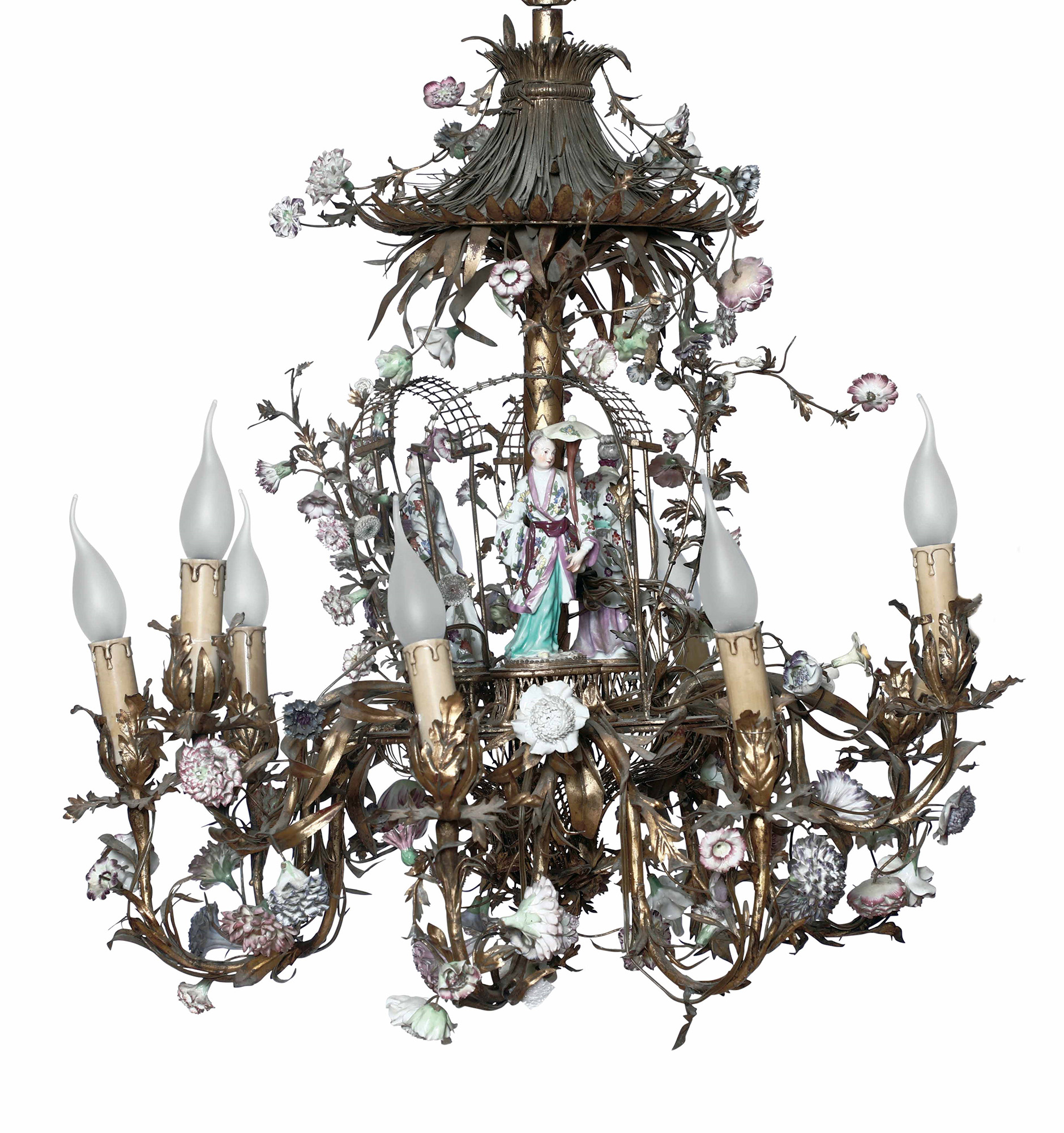 Lampadario a otto fiamme in metallo dorato e porcellana policroma. XIX-XX secolo