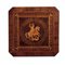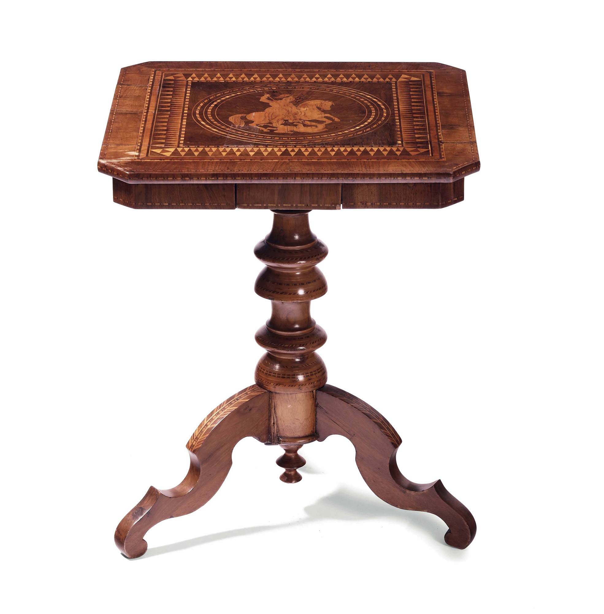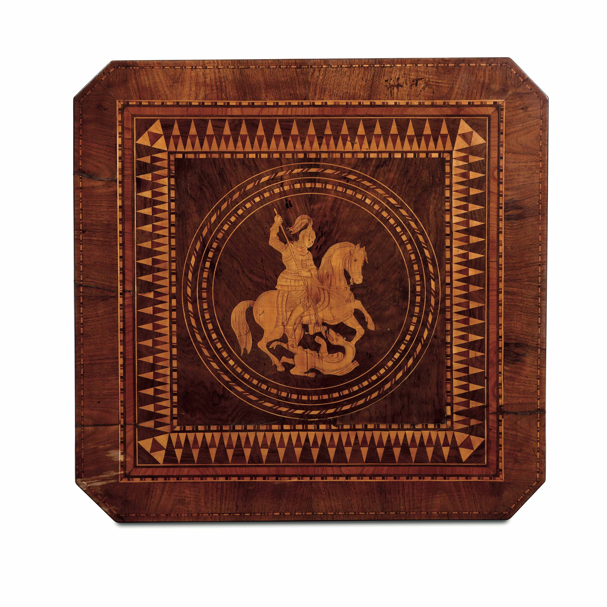 Tavolino in legno lastronato ed intarsiato. Ebanisteria sorrentina XIX secolo, Piano quadrangolare centrato da San Giorgio e il drago entro riserva circolare, fascia con cassetto, gamba tornita terminante su tre piedi a voluta, W. 62 - D. 60 - H. 75 Cm