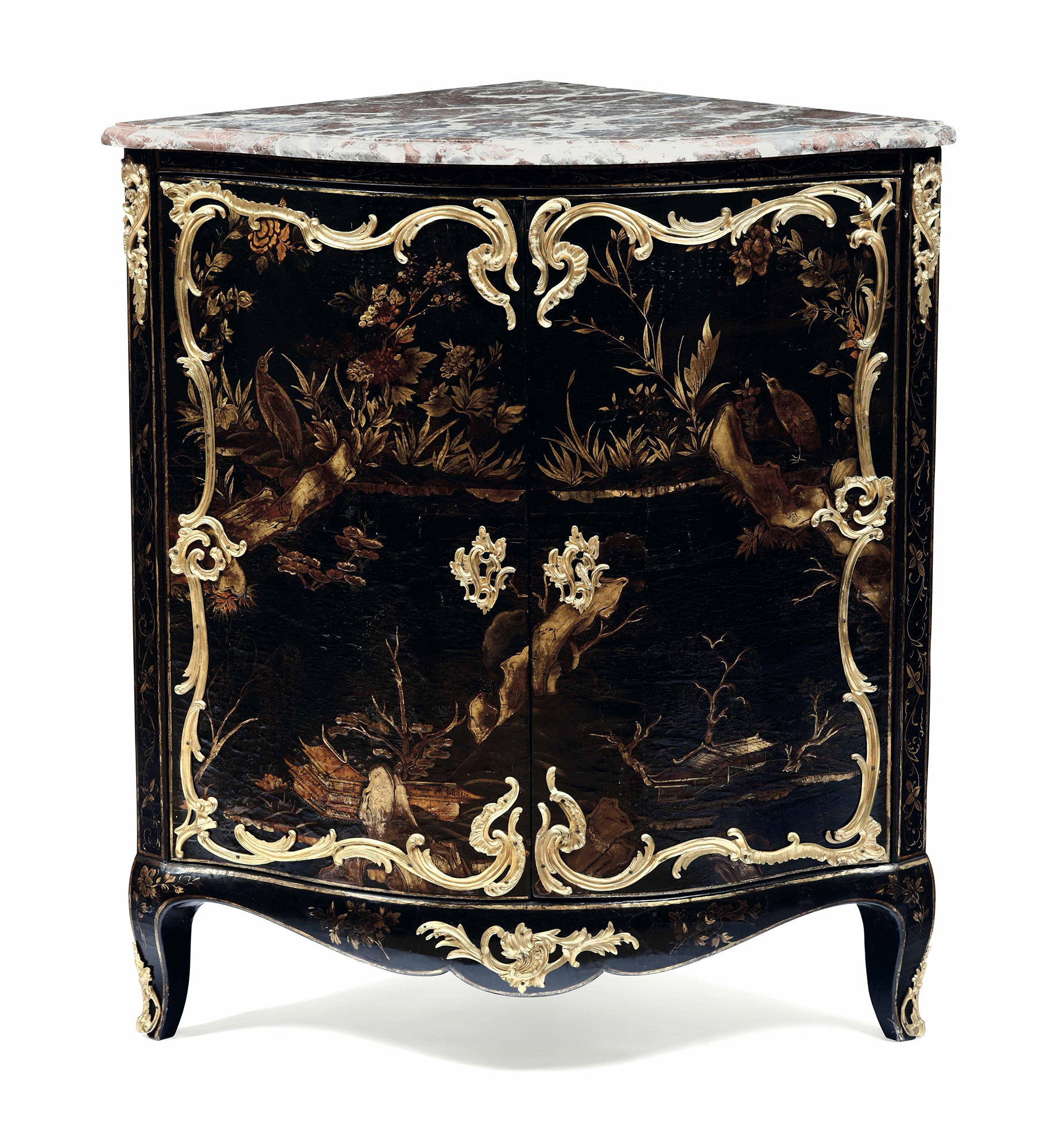 Angolare Luigi XV in legno laccato a cineserie. Francia XVIII secolo, due ante sul fronte con applicazioni in bronzo dorato e cesellato; piano in marmo, W. 80 - D. 57 - H. 97 Cm