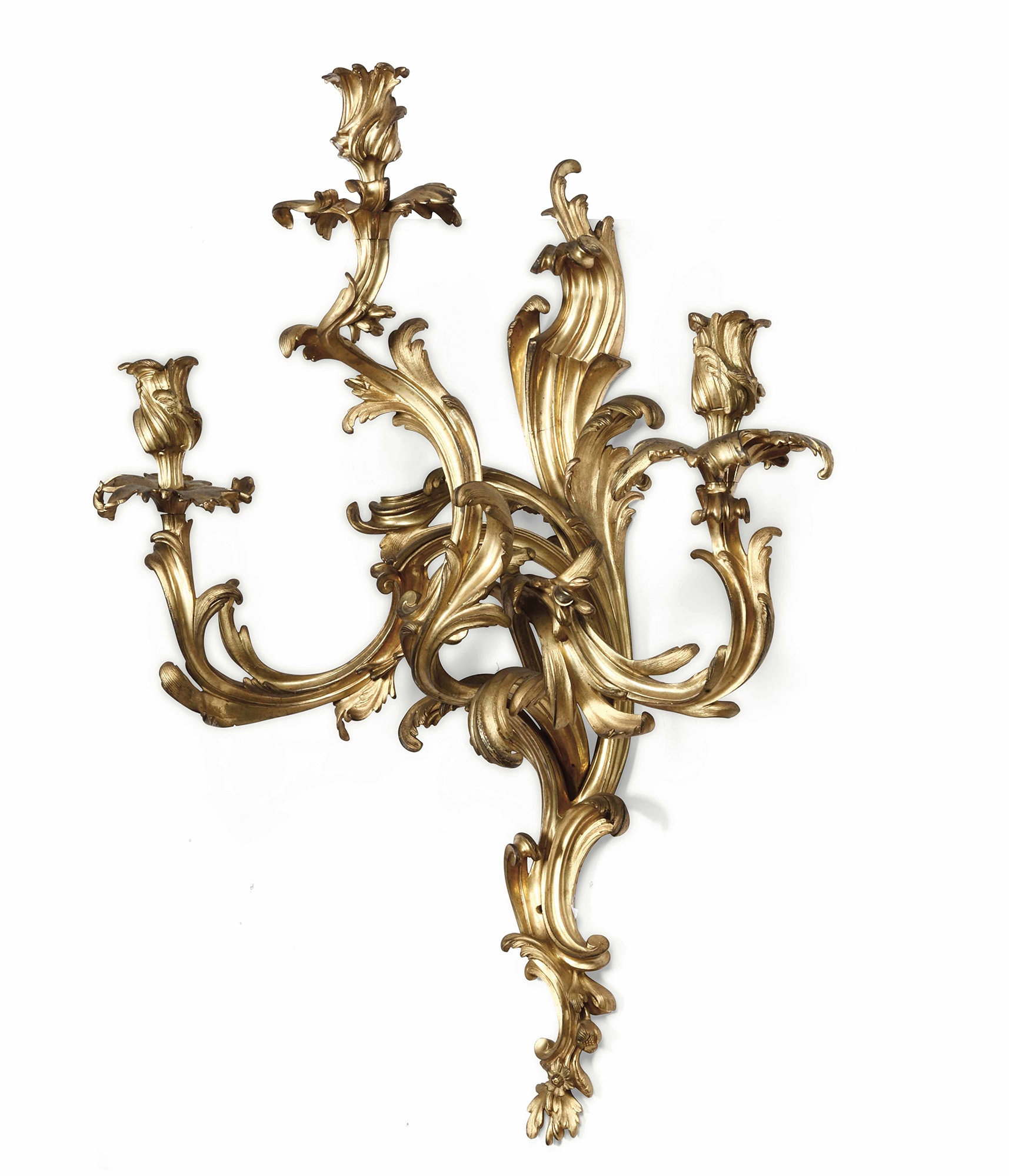 Coppia di grandi appliques a tre fiamme in bronzo dorato. Francia probabile XVIII secolo, decori a volute ed elementi fogliacei. Stampigliate D 763, lettere M R intervallate da corona, W. 68 - D. 30 - H. 90 Cm