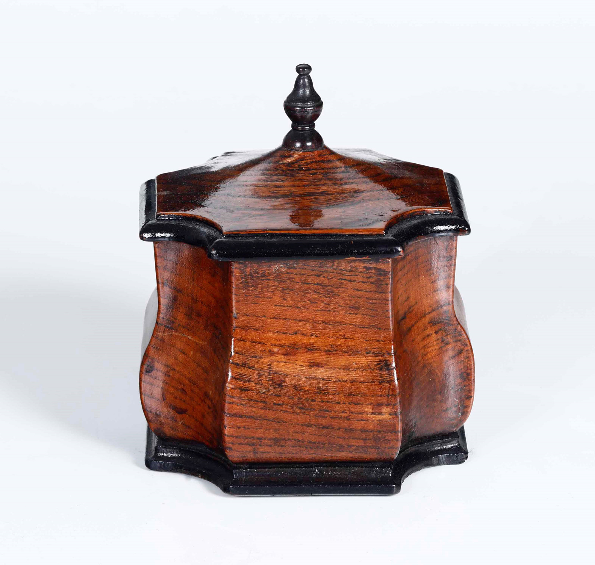 Scatola in legno di forma sagomata, profili ebanizzati. XIX-XX secolo, coperchio con presa tornita, W. 13 - H. 14 Cm