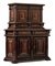 Credenza in legno, Francia XVIII secolo, due corpi rispettivamente a due ante, decorata da volti in rilievo, racemi e tralci d'uva nella fascia e nei montanti. Intarsi in ottone, W. 177 - D. 70 - H. 135 Cm