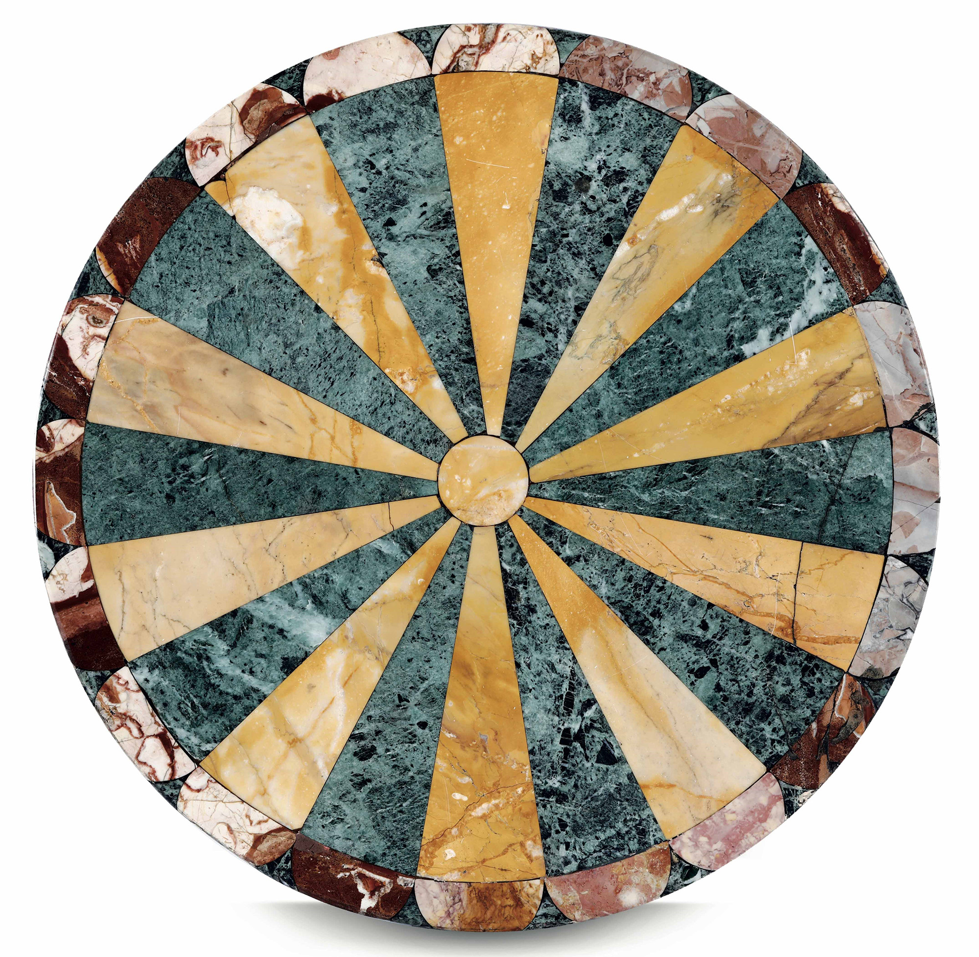 Piano di forma circolare lastronato in marmi policromi, decoro a raggiera. XIX - XX secolo