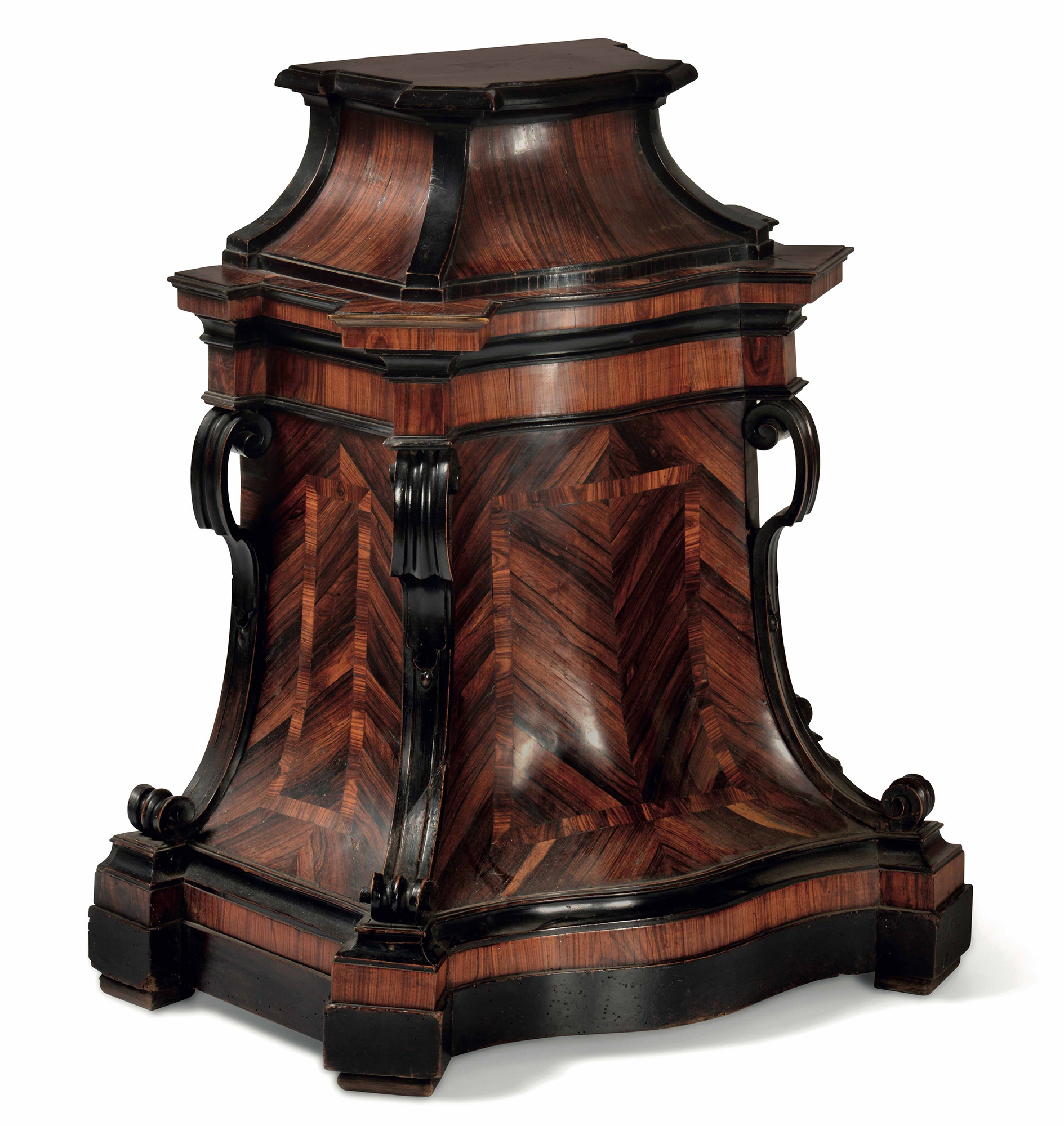 Base sagomata lastronata in legni vari con profili ebanizzati. Area lombarda, XVIII secolo, W. 56 - D. 30 - H. 90 Cm