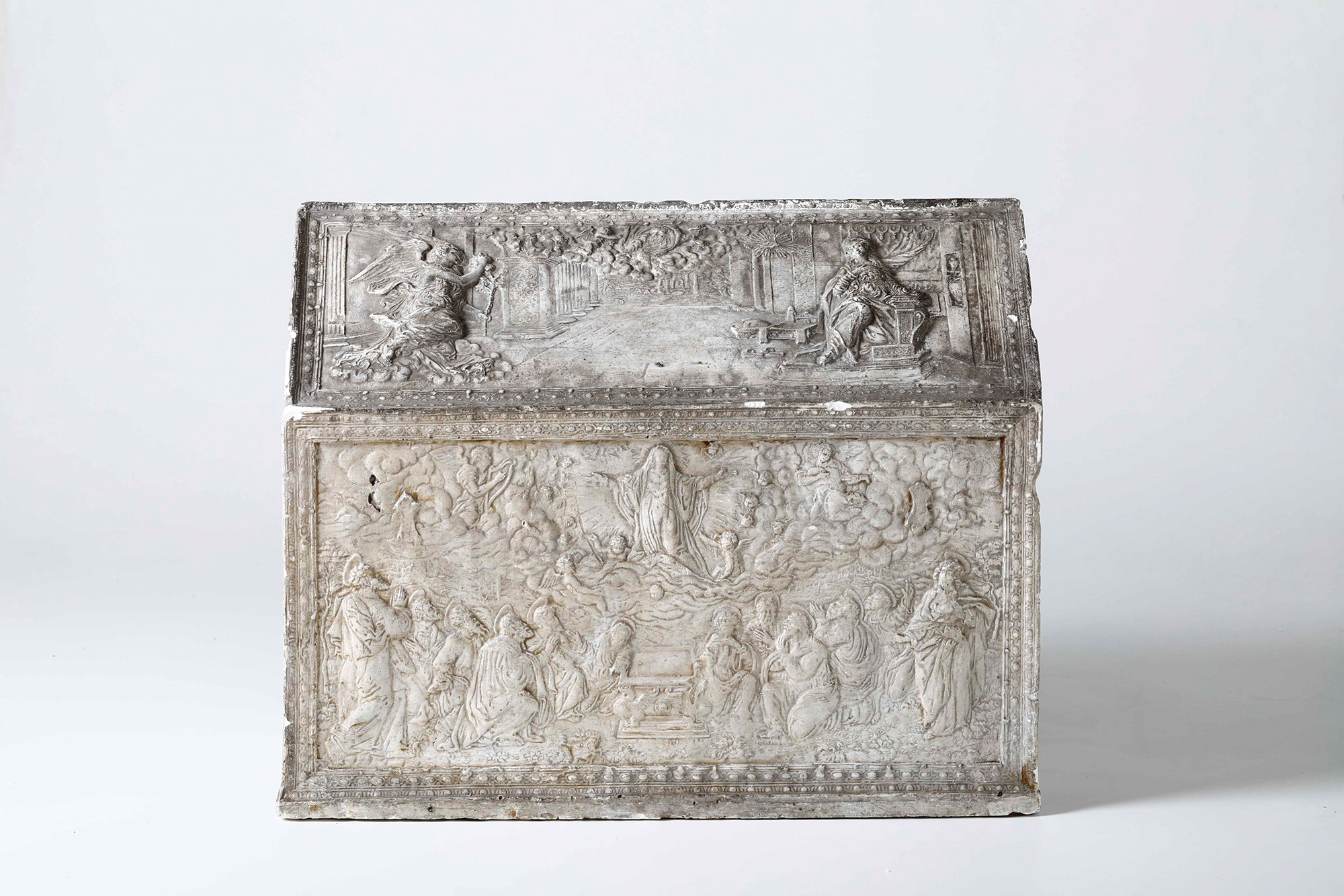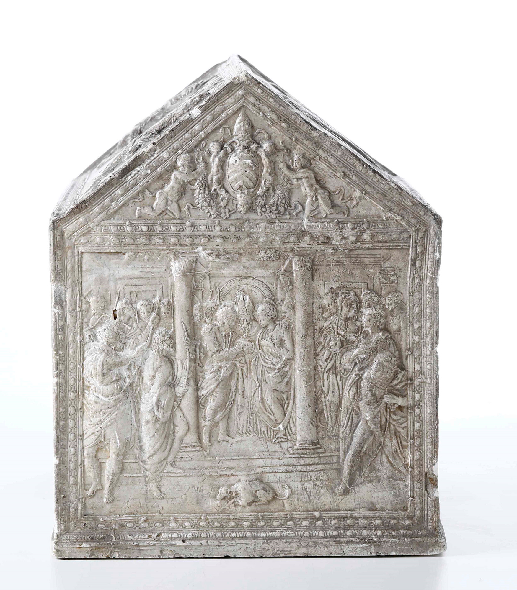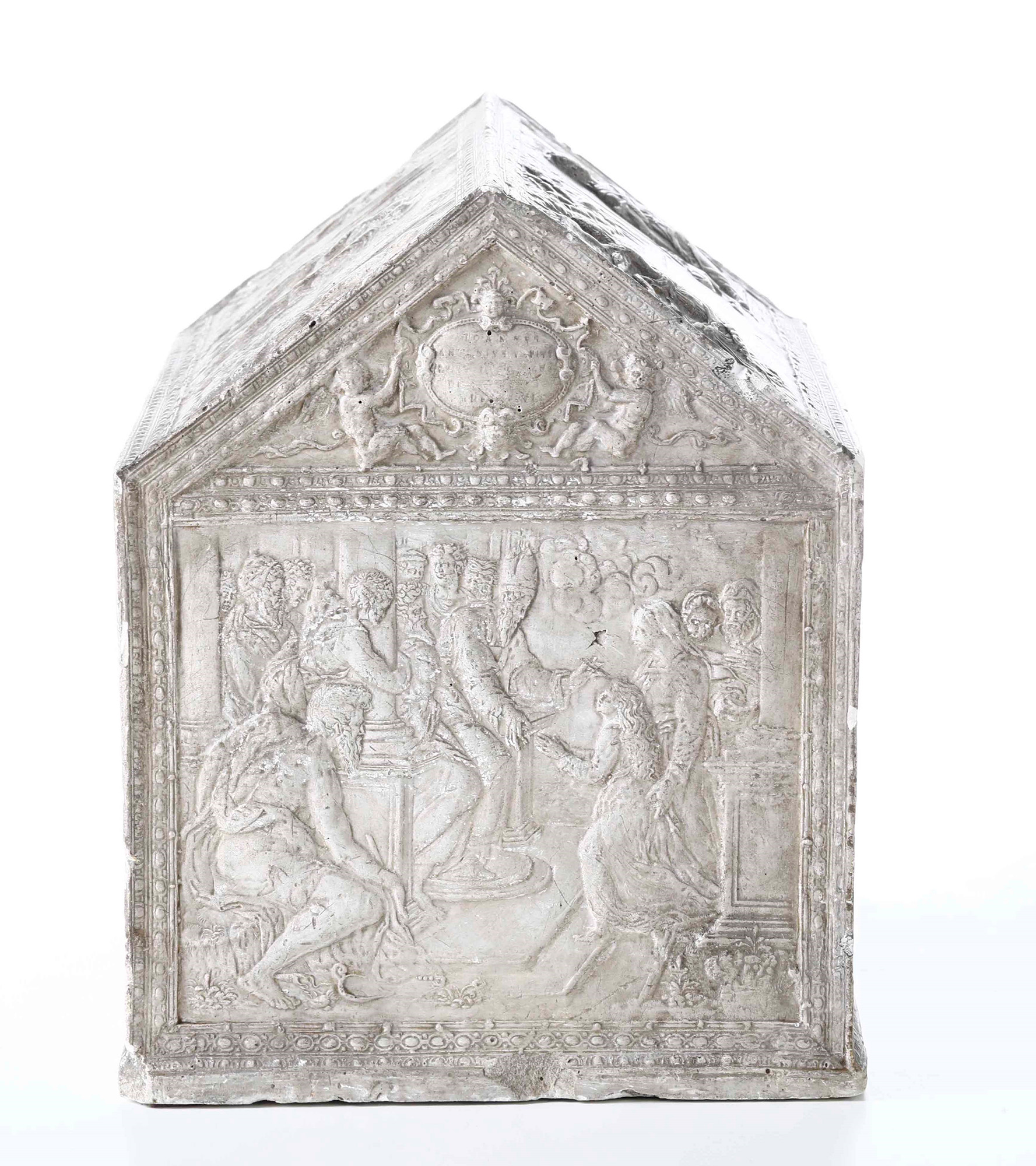Modello di urna in gesso con raffigurazioni della vita della Vergine Maria di gusto rinascimentale. XIX secolo