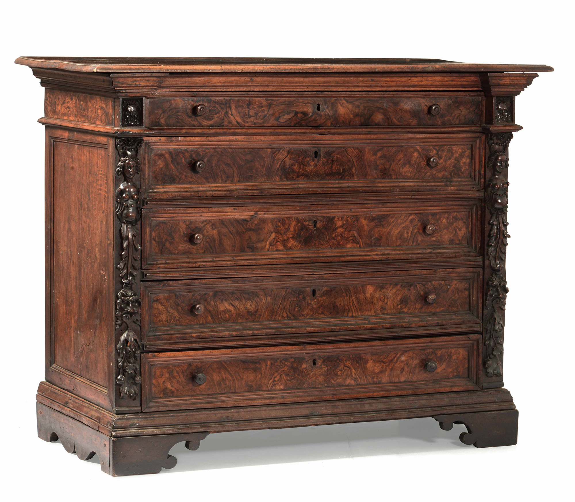 Comò in noce intagliato e radica di noce. Italia centrale XVII secolo, lesene intagliate con cariatidi femminili ed elementi vegetali, cinque cassetti sul fronte, piede a mensola, W. 163 - D. 77 - H. 132 Cm