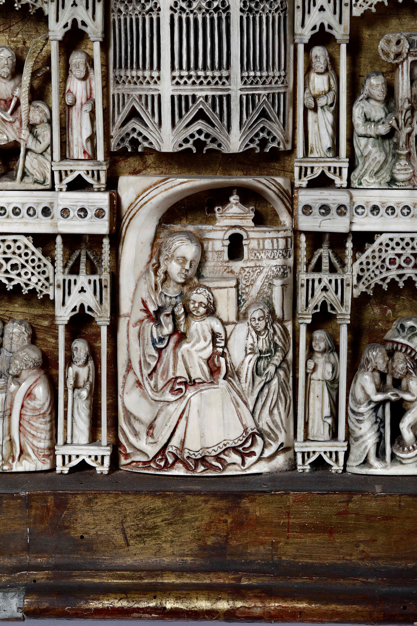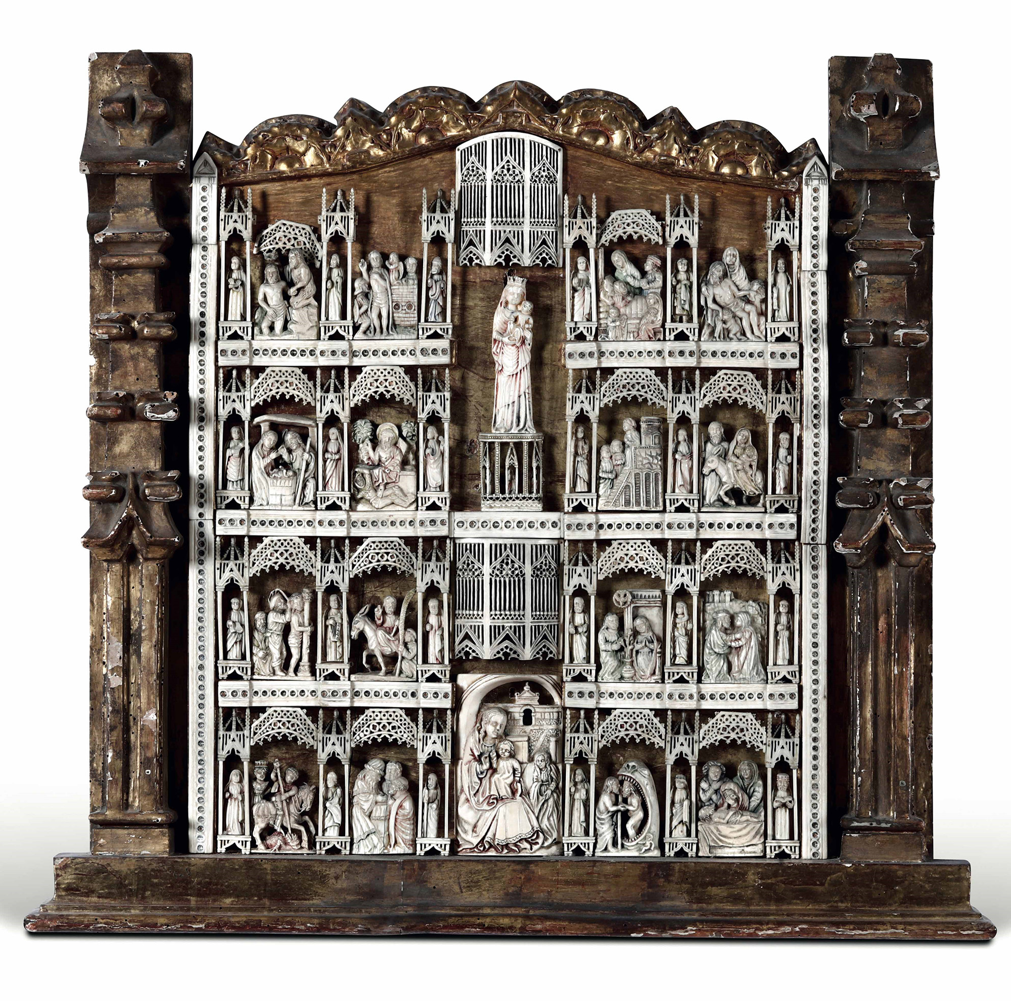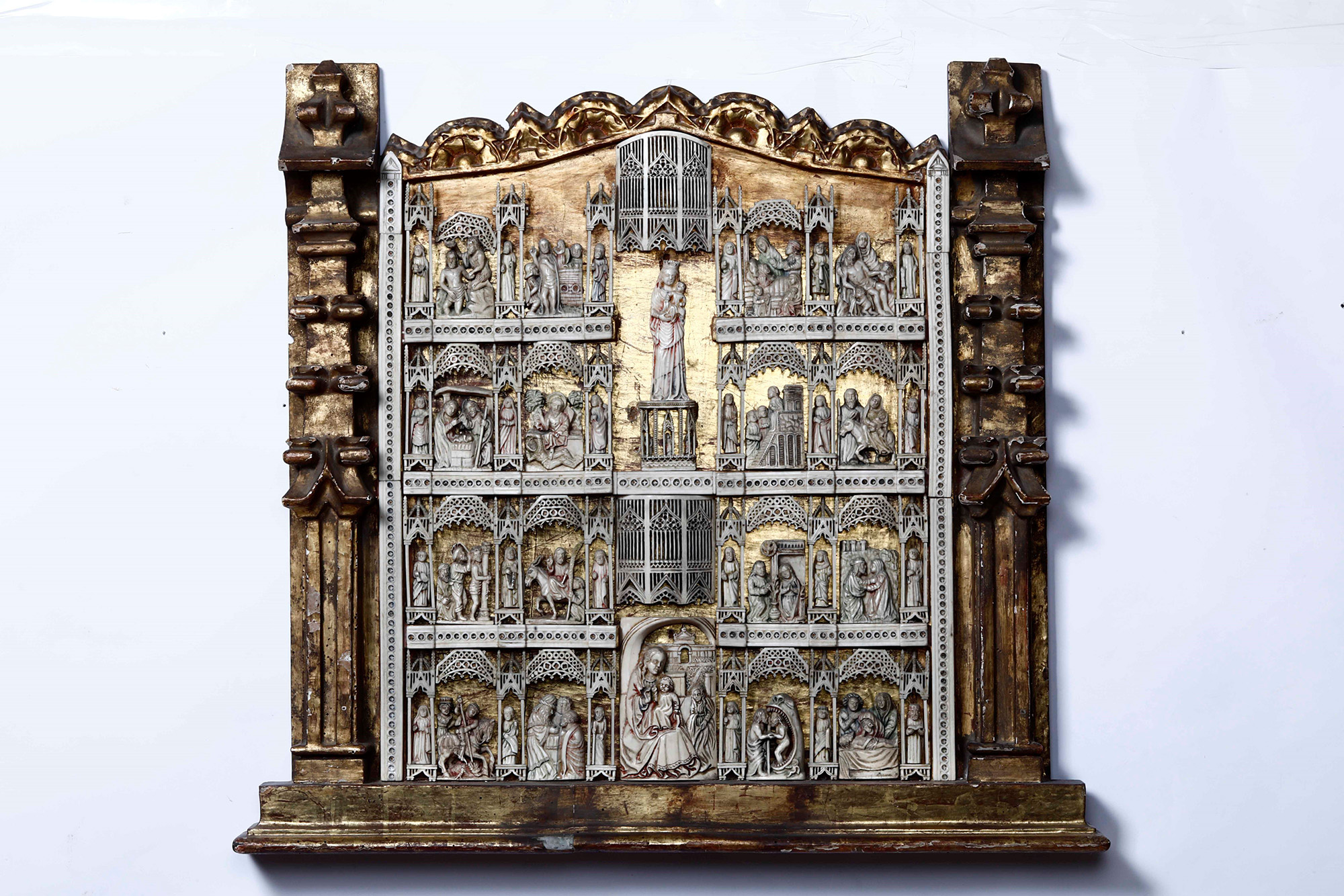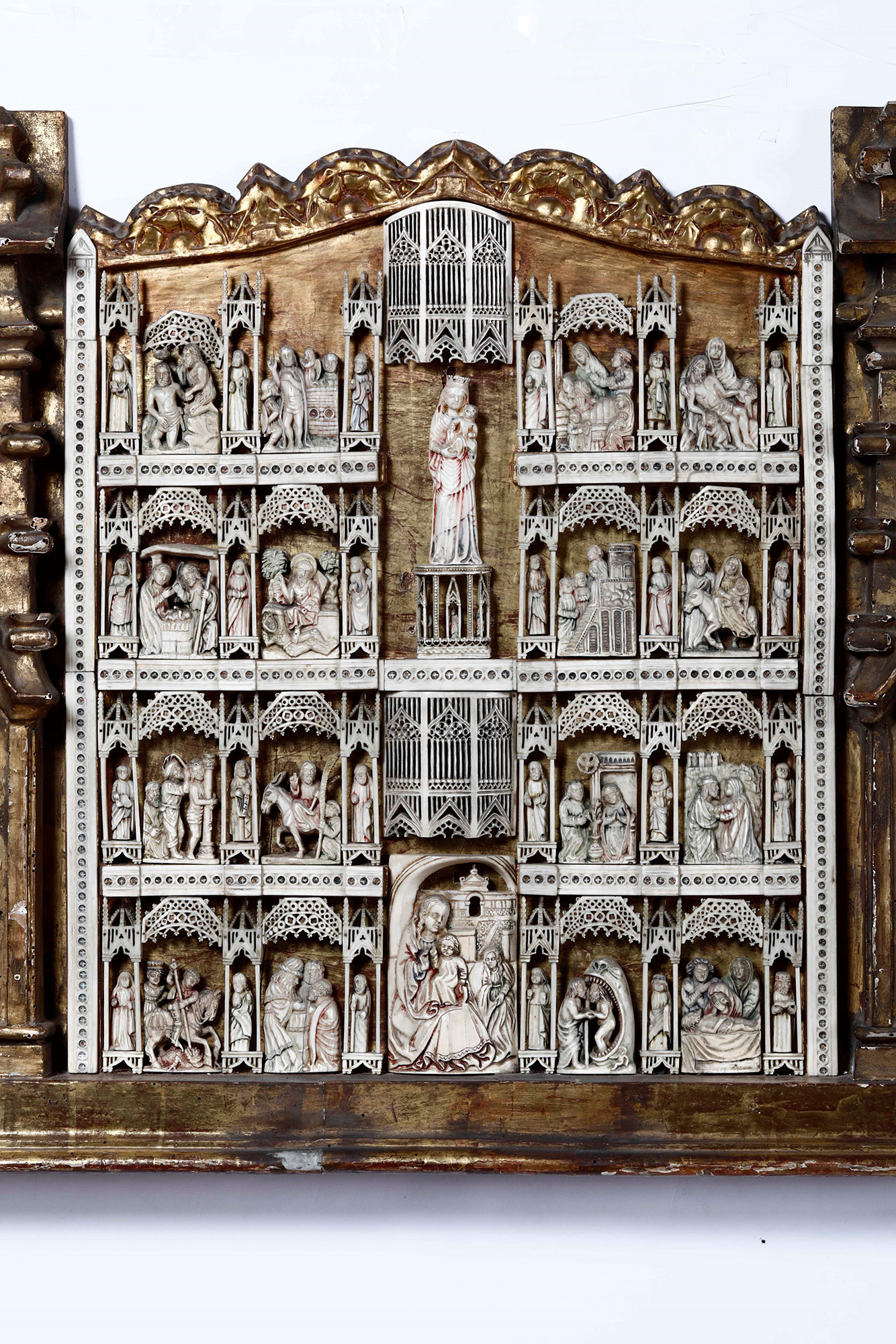 Pannello in avorio traforato e intagliato con scene della Vita di Cristo. XIX-XX secolo, Al centro figura di Madonna con Bambino a tutto tondo. , In cornice in legno intagliato e dorato, W. 72 - H. 67 Cm