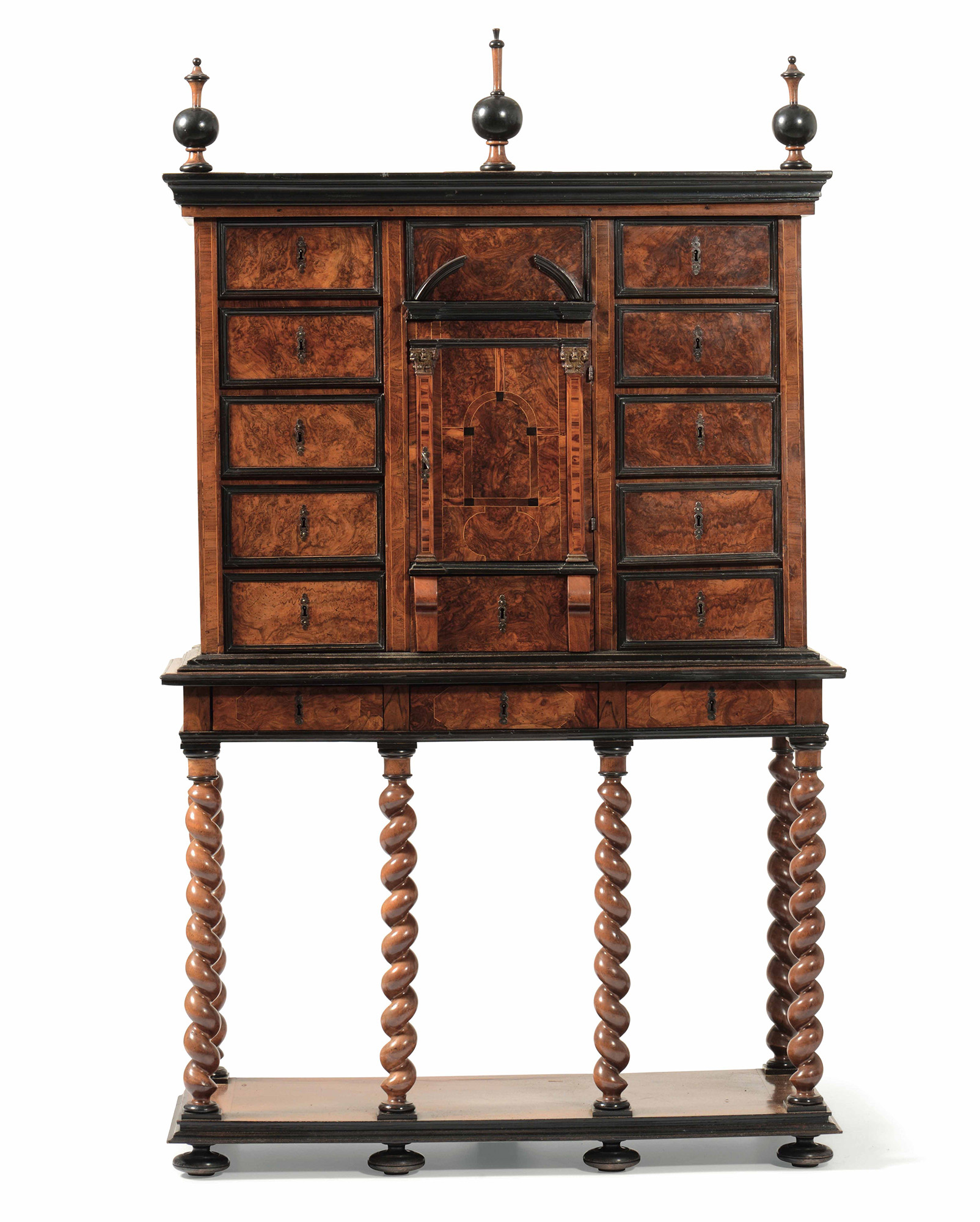 Stipo monetiere a doppio corpo in radica e altre essenze. Europa centrale XVIII secolo, parte superiore a cassetti, sormontata da pinnacoli torniti ed ebanizzati, base con gambe a torciglione, W. 129 - D. 52 - H. 215 Cm