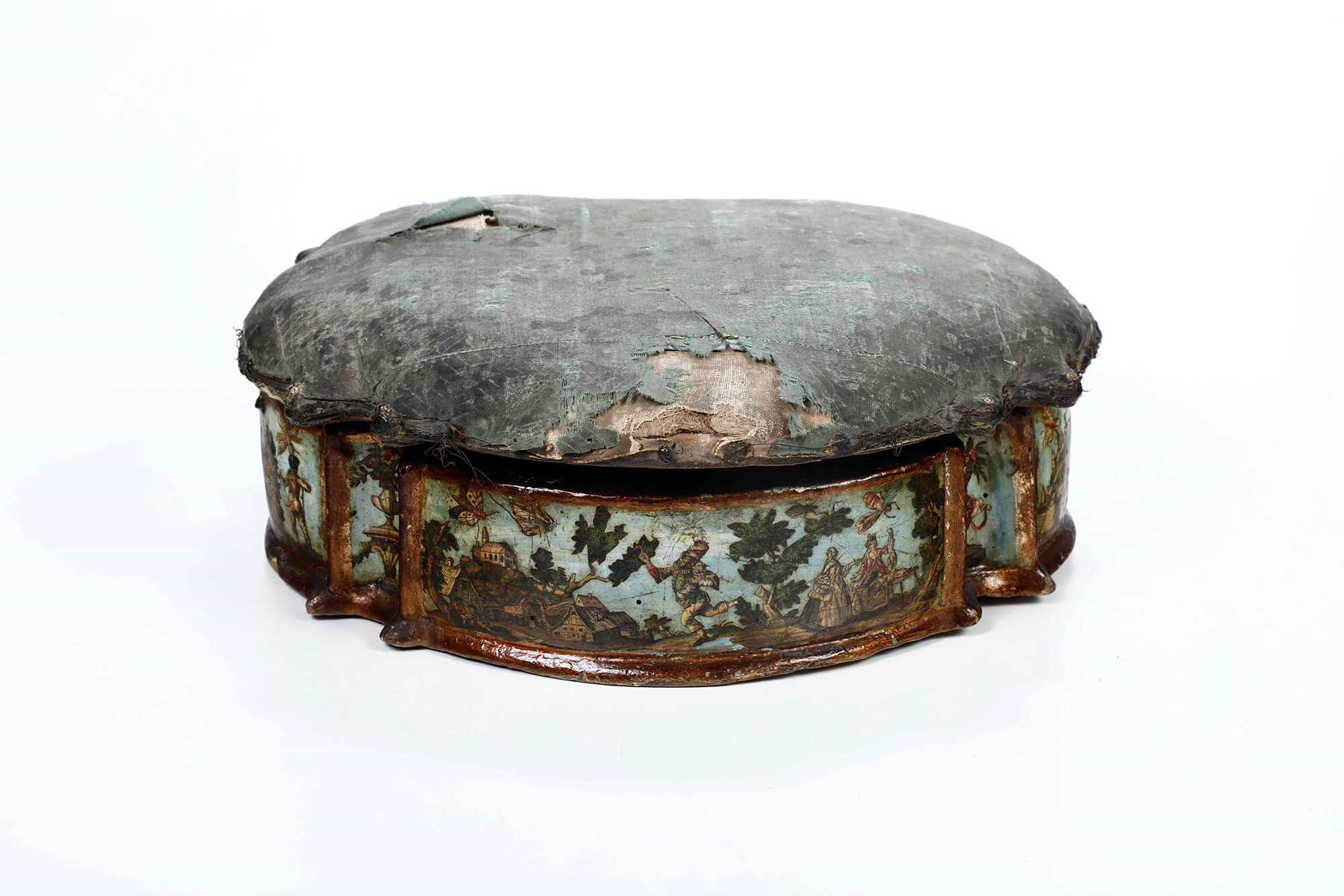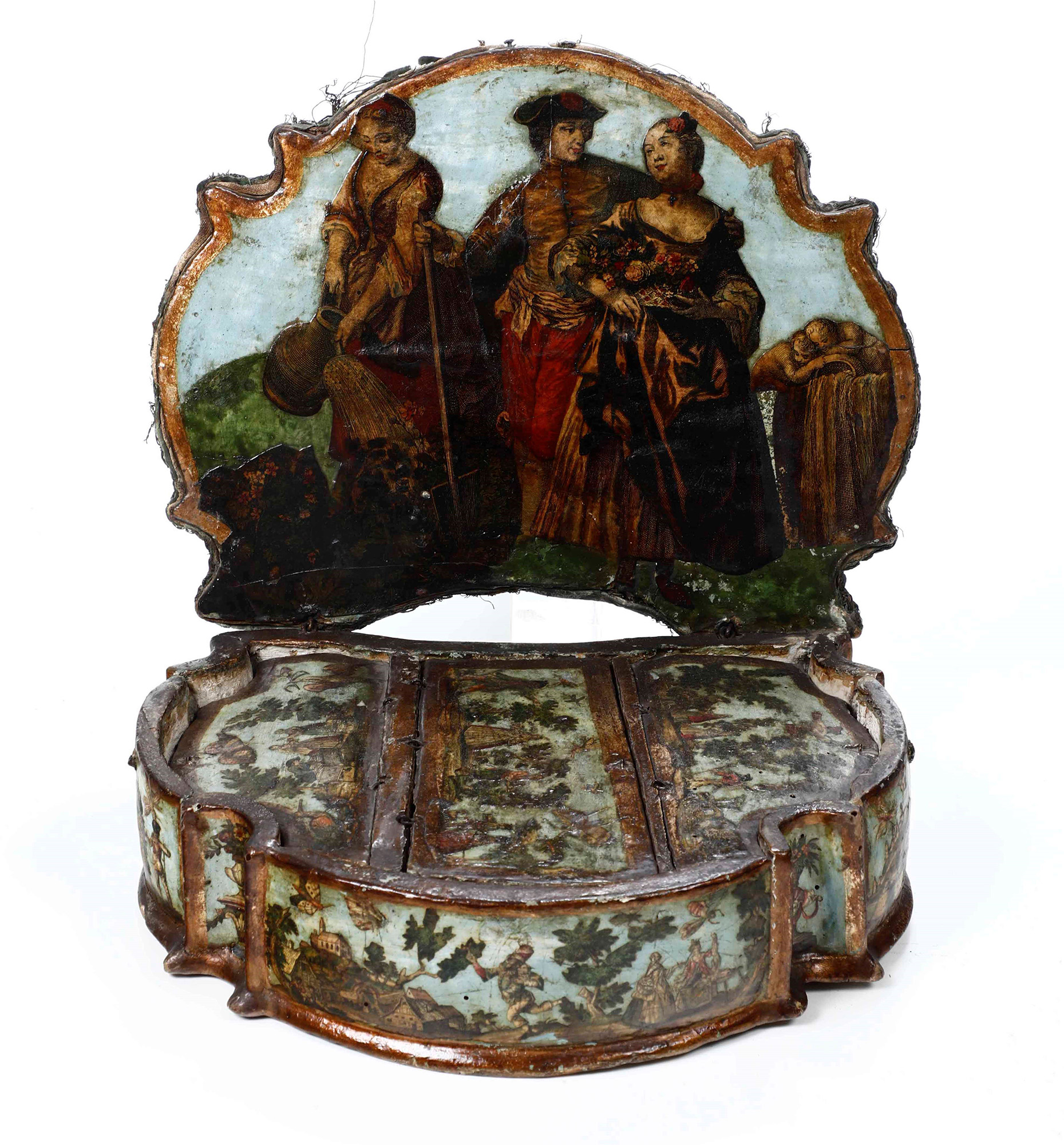 Scatola da cucito in legno laccato e decorato ad arte povera. Arte veneziana, XVIII secolo, decorata con personaggi in costume settecentesco, W. 30 - D. 24 - H. 12 Cm