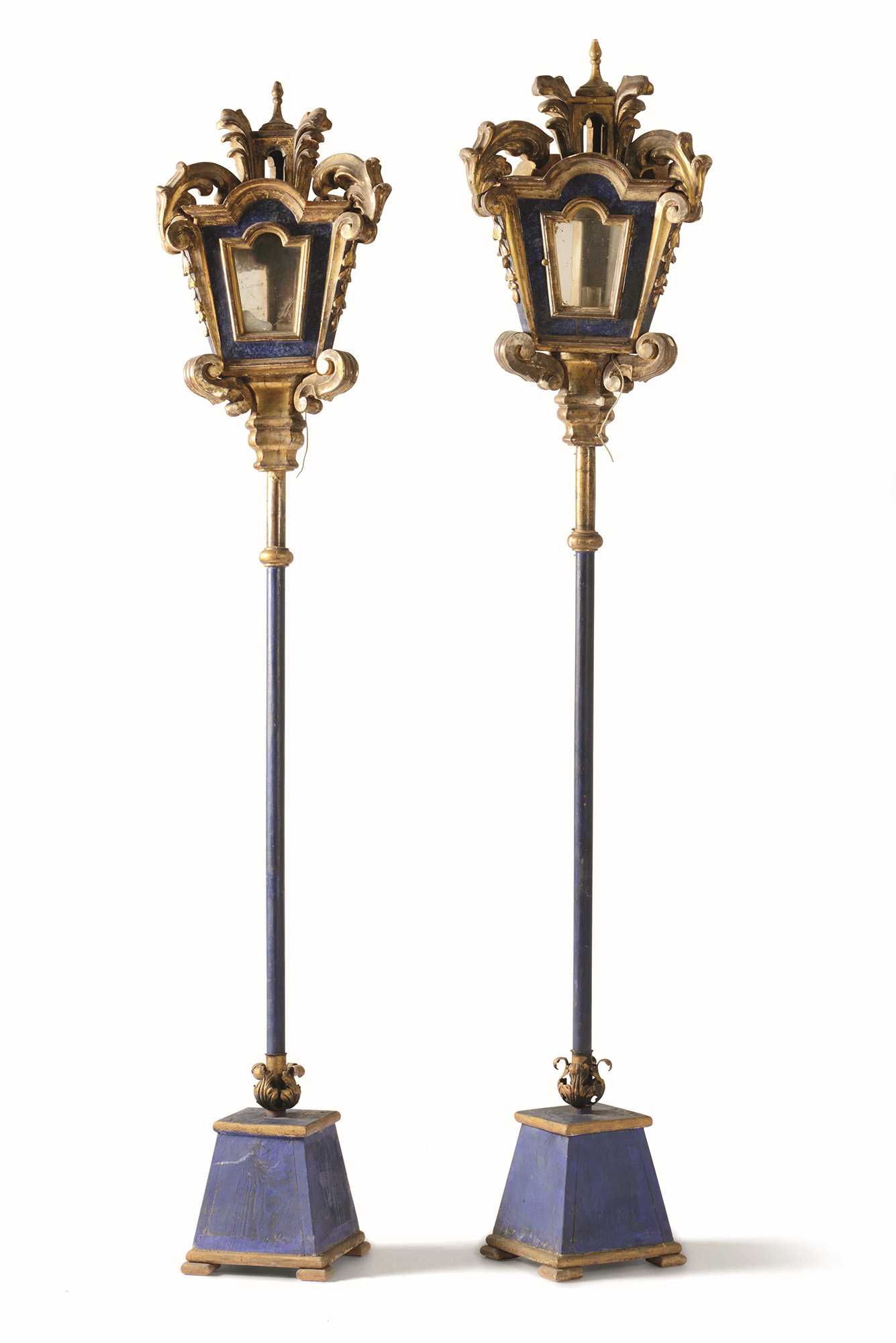 Coppia di lampioni da processione in legno intagliato e dipinto, XVIII-XIX secolo