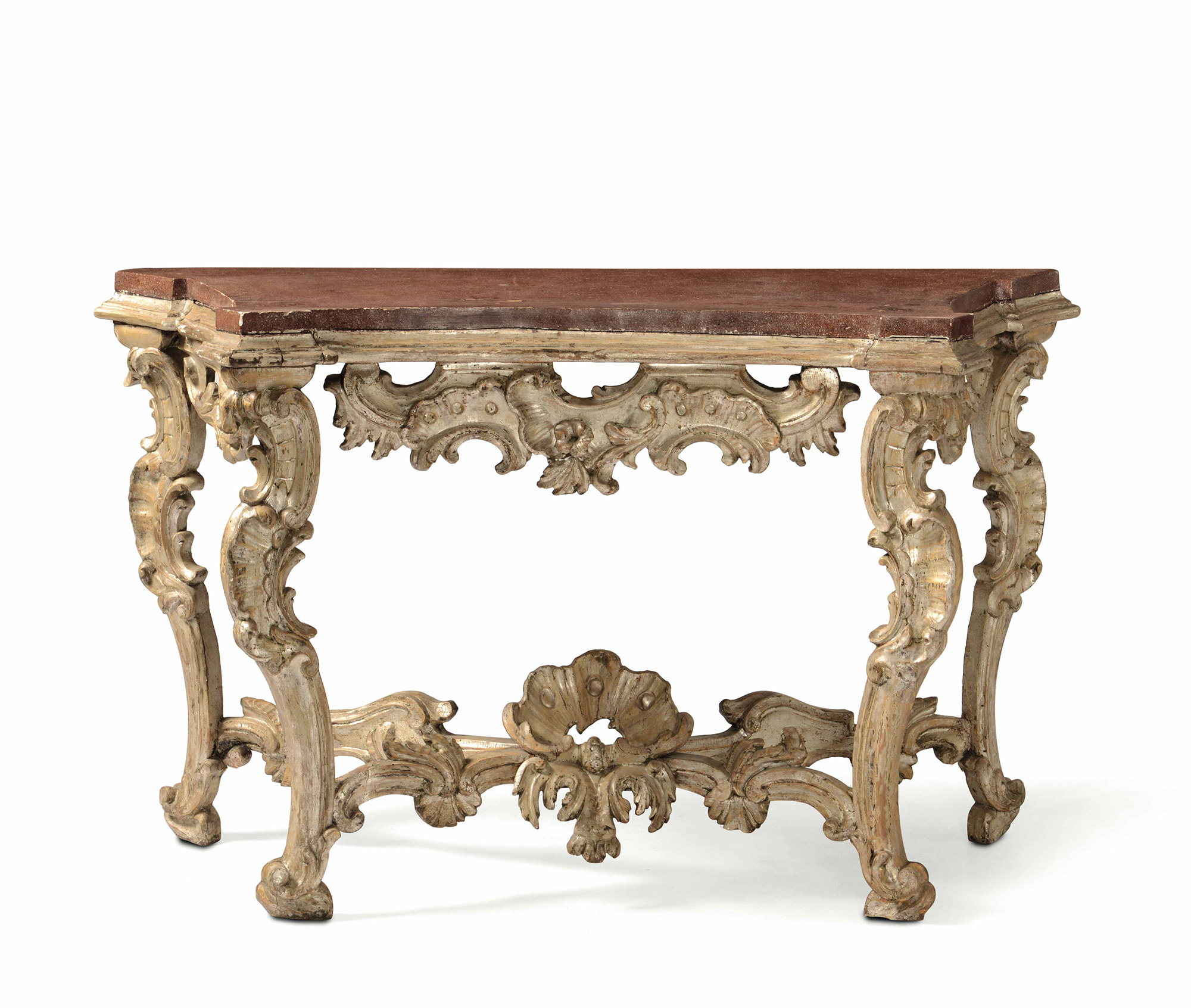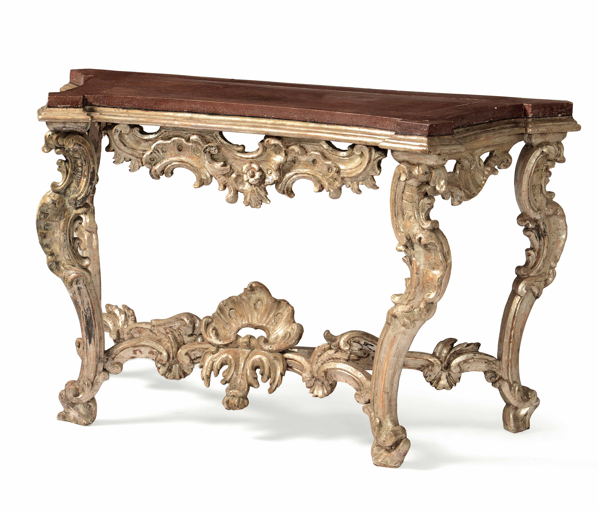 Coppia di consolles in legno intagliato e argentato, Italia centrale, XVIII secolo, Gambe scolpite a volute, terminanti a ricciolo e riunite da traversa centrata da valva di conchiglia. Piano sagomato laccato in finto porfido d’epoca, W. 145 - D. 67 - H. 87 cm