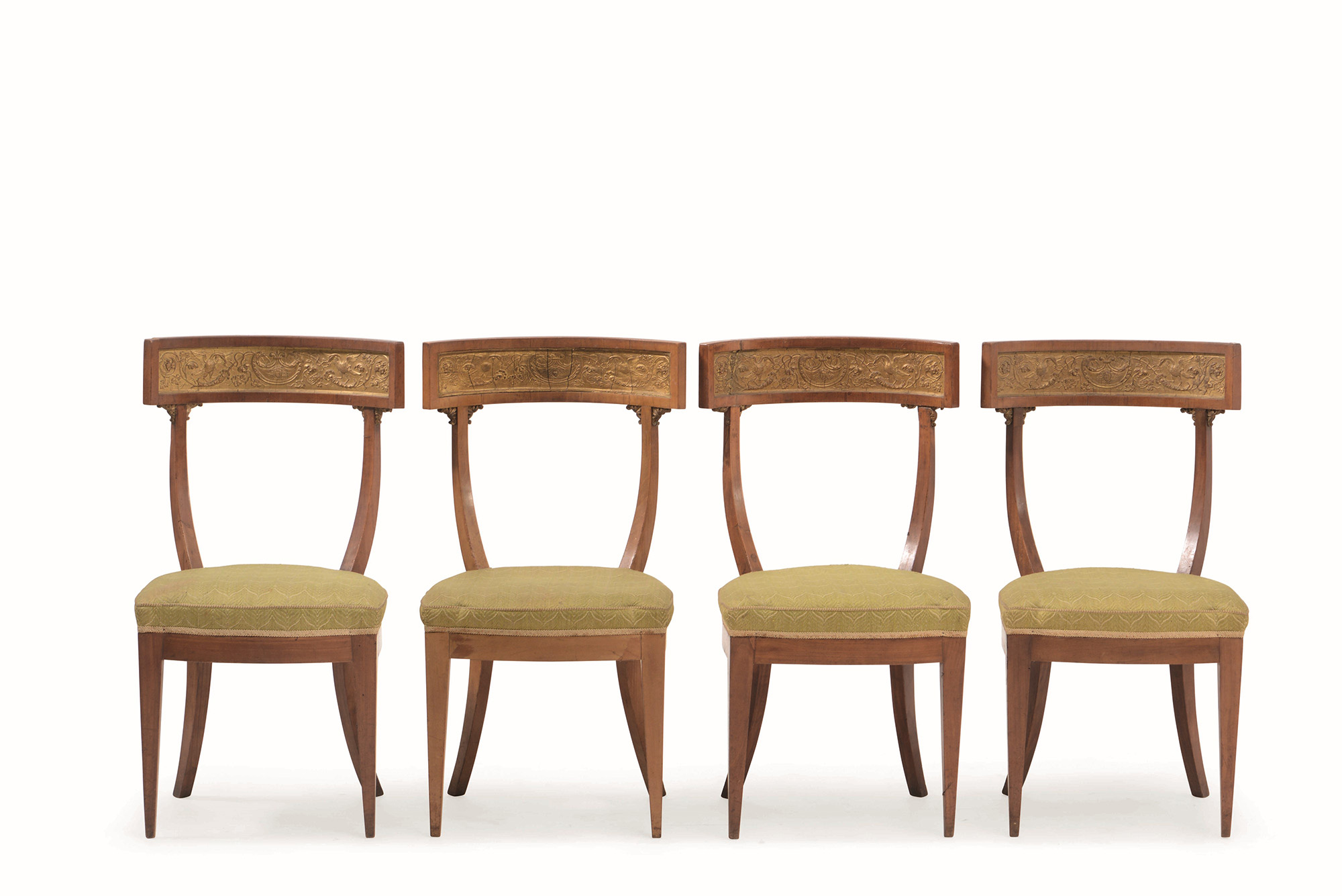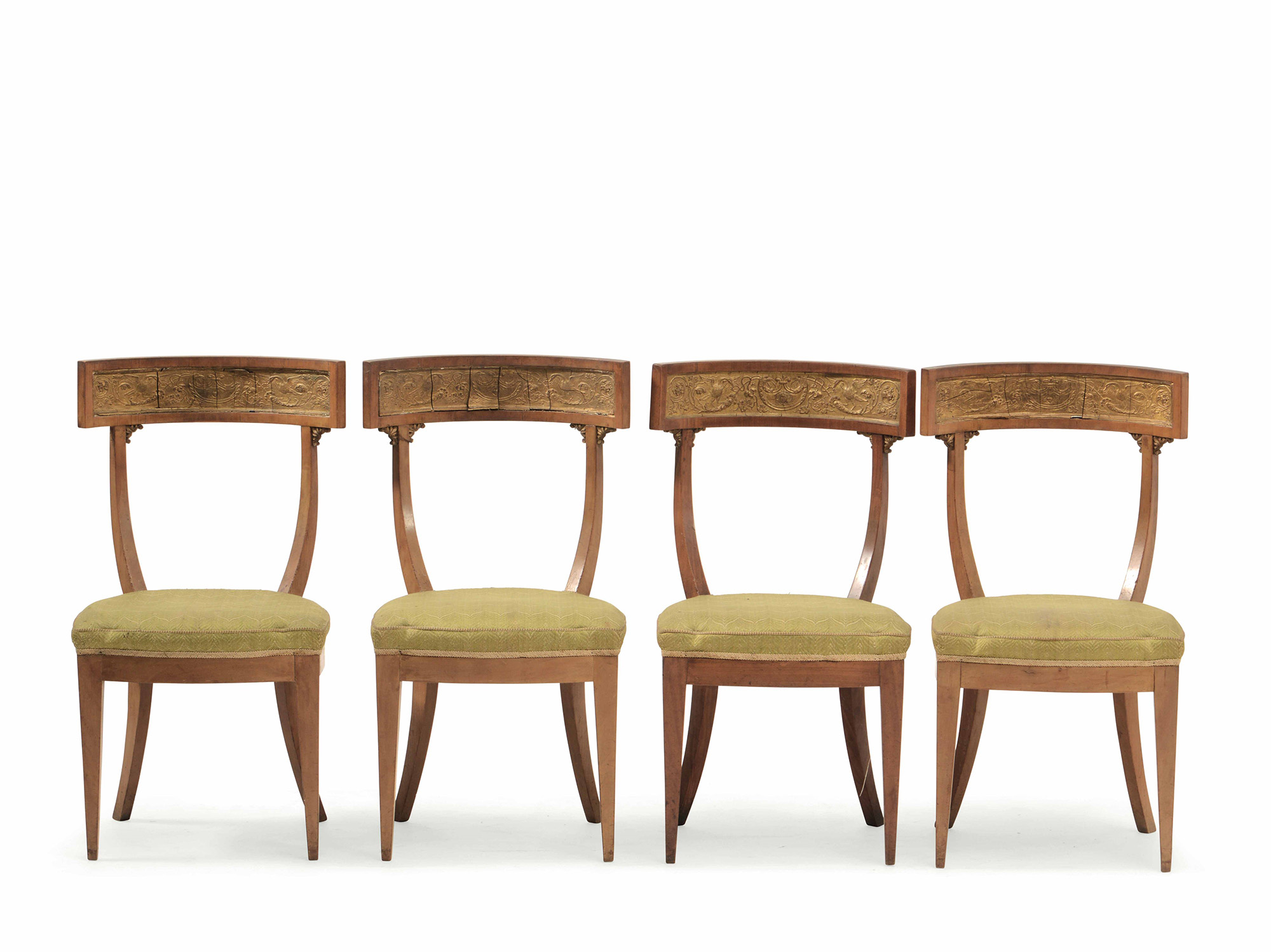 Quattro sedie Direttorio in ciliegio, Toscana, XIX secolo., schienale decorato con cartella a pastiglia dorata, nel lotto altre quattro sedie en suite di epoca posteriore