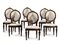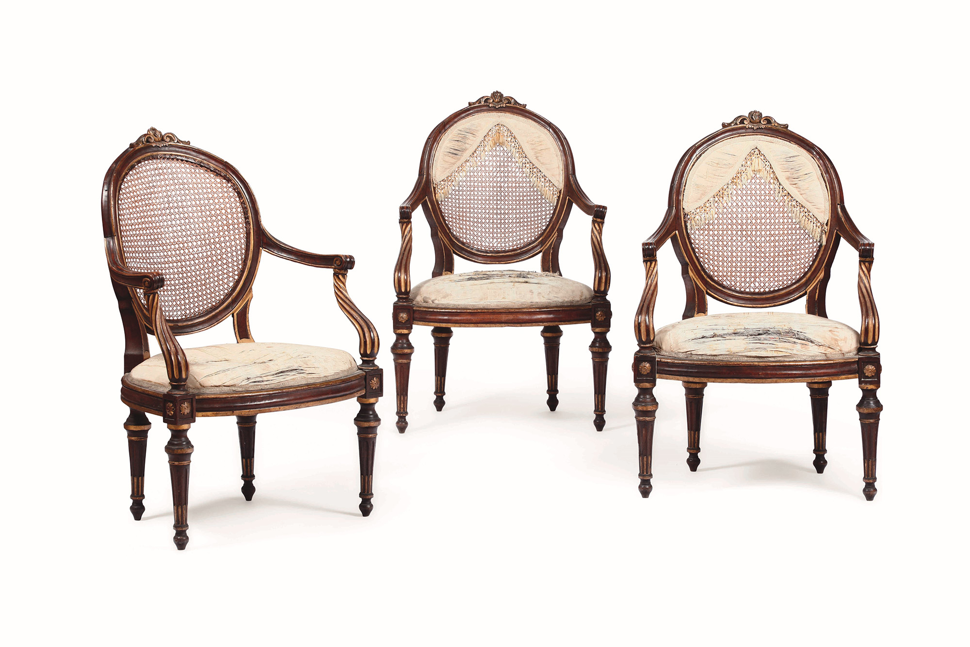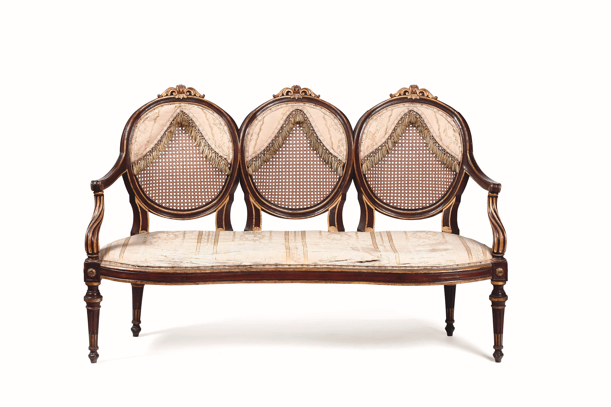 Salotto in legno di noce intagliato e dorato, XVIII-XIX secolo, composto da divano a tre posti, sei sedie e tre poltrone con schienale in cannetè, gambe troncoconiche scanalate, cm 144x44x93, cm 48x44x93