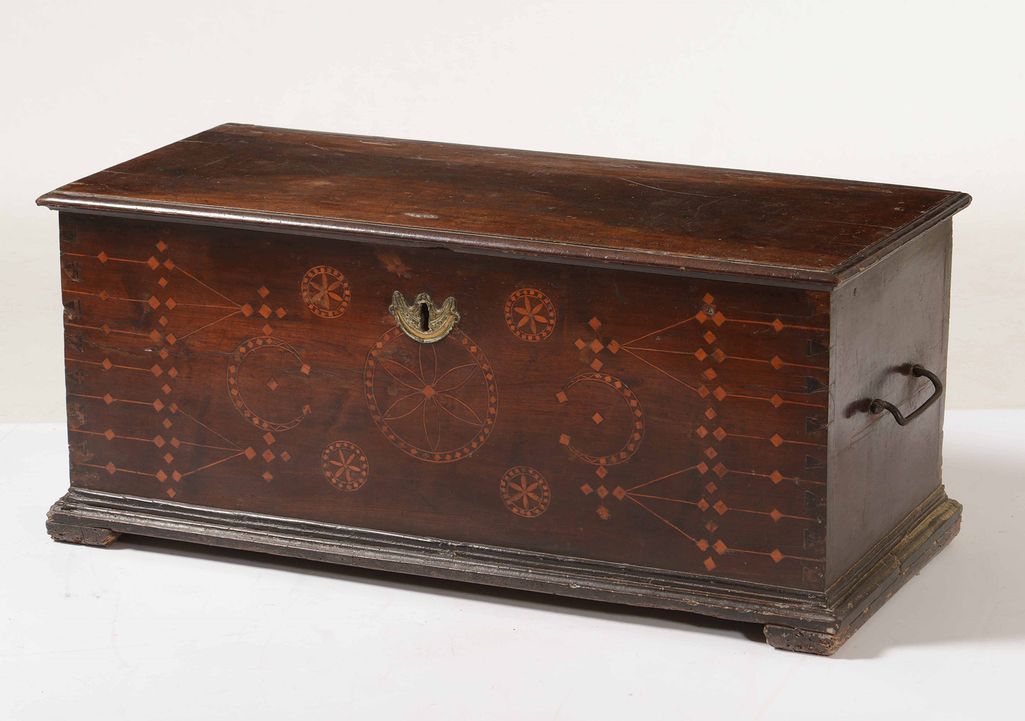 Cassetta da viaggio in legno intarsiato a motivi geometrici.Italia o Spagna, XVII secolo, W. 130 - D. 58 - H. 58 cm