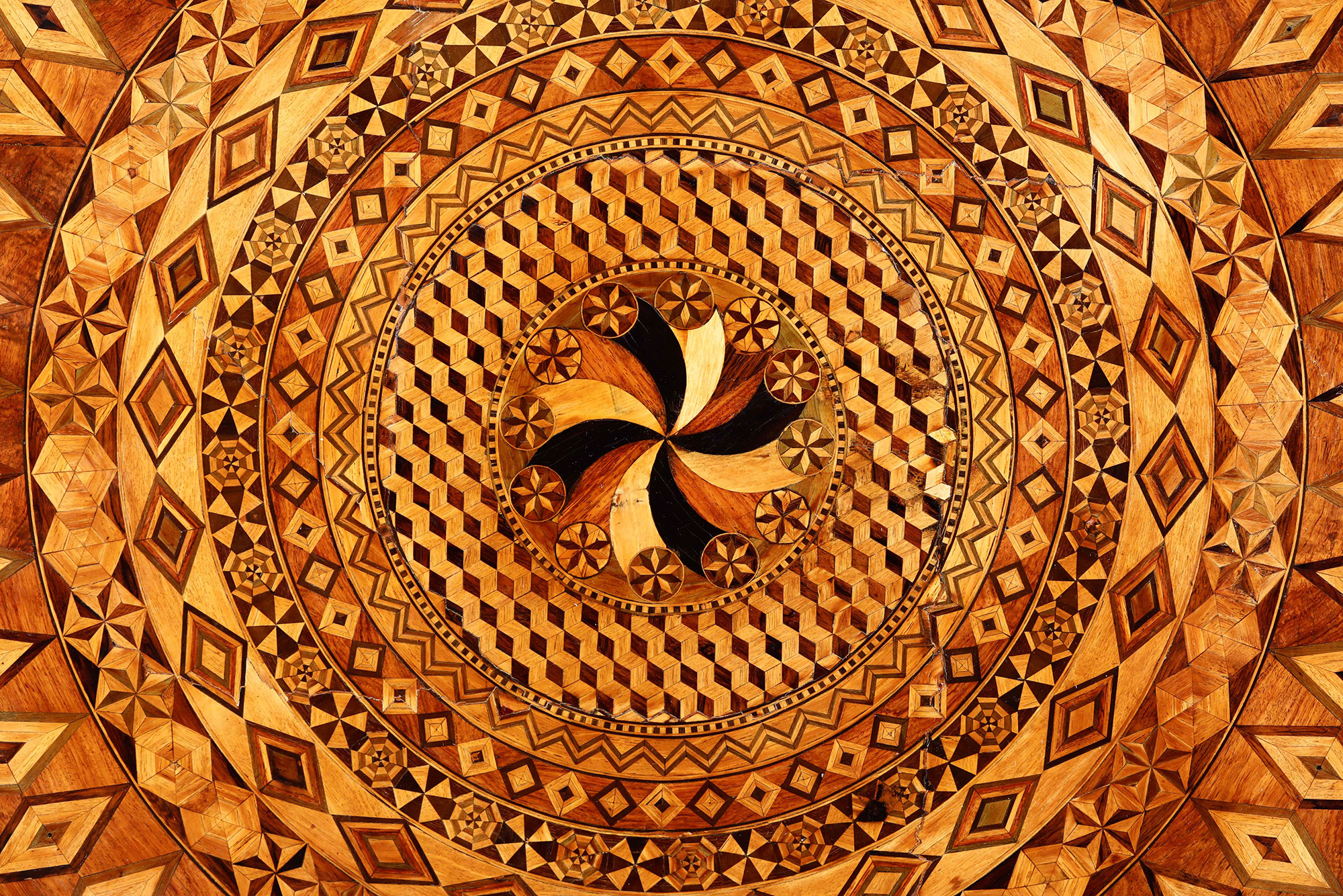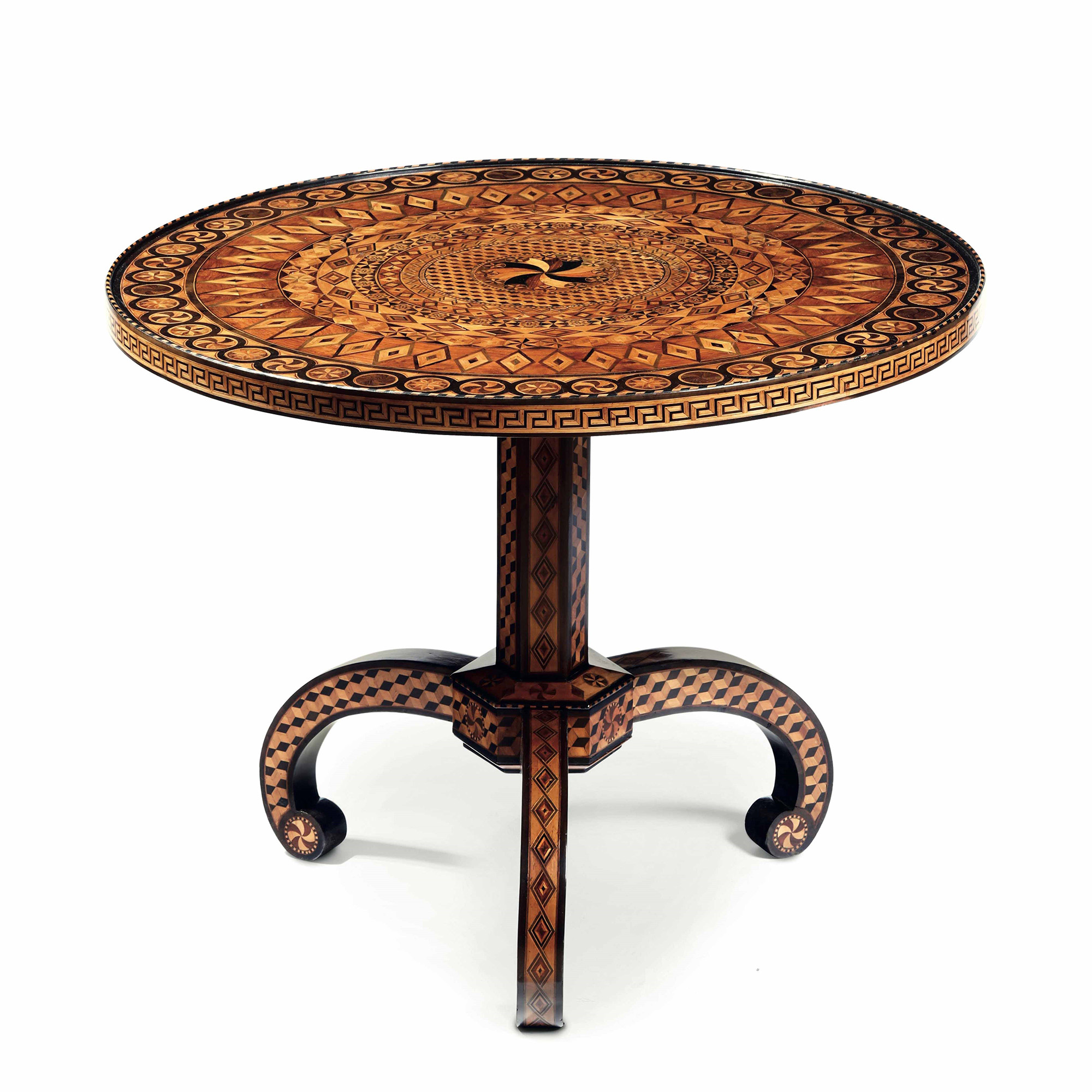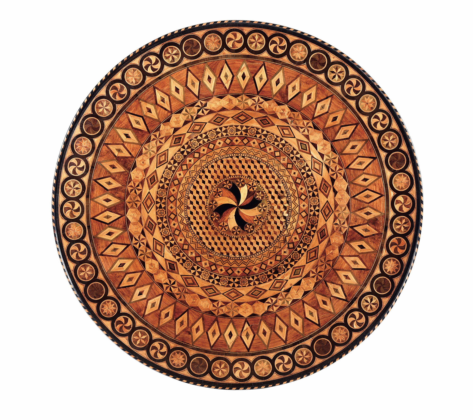 Tavolo circolare interamente intarsiato in varie essenze, XIX-XX secolo