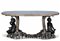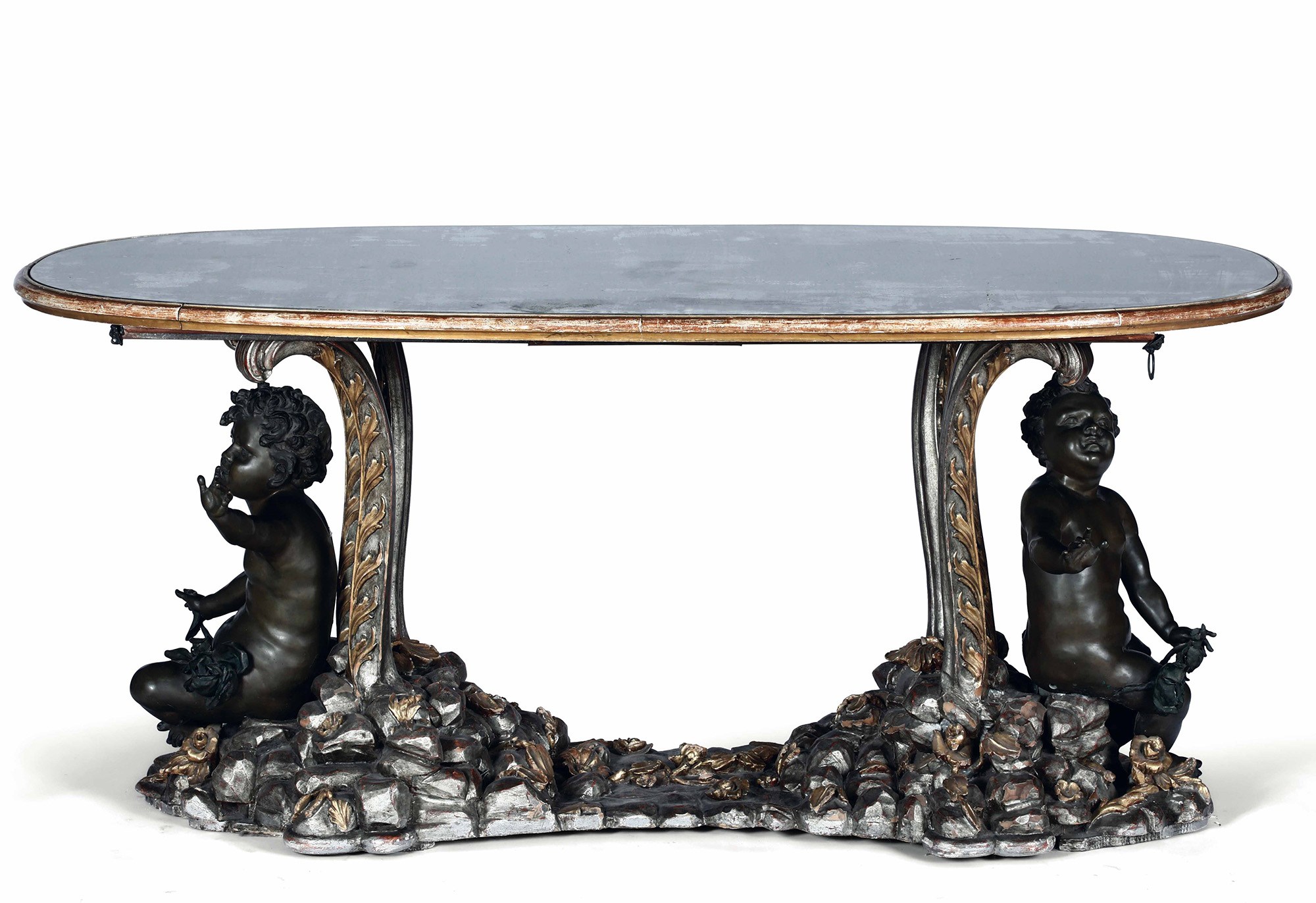 Tavolo in legno intagliato, dorato con putti in bronzo patinato. XX secolo, base rocciosa su cui siedono due putti in bronzo. Piano ovale in legno con profilo dorato