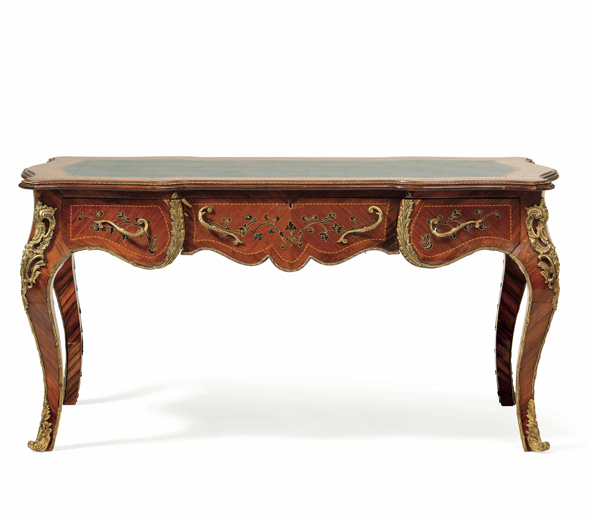 Scrivania diplomatica Napoleone III. XIX secolo, piano sagomato in pelle, tre cassetti sulla fascia, gambe arcuate, applicazioni di bronzi dorati, W. 168 - D. 84 - H. 83 Cm