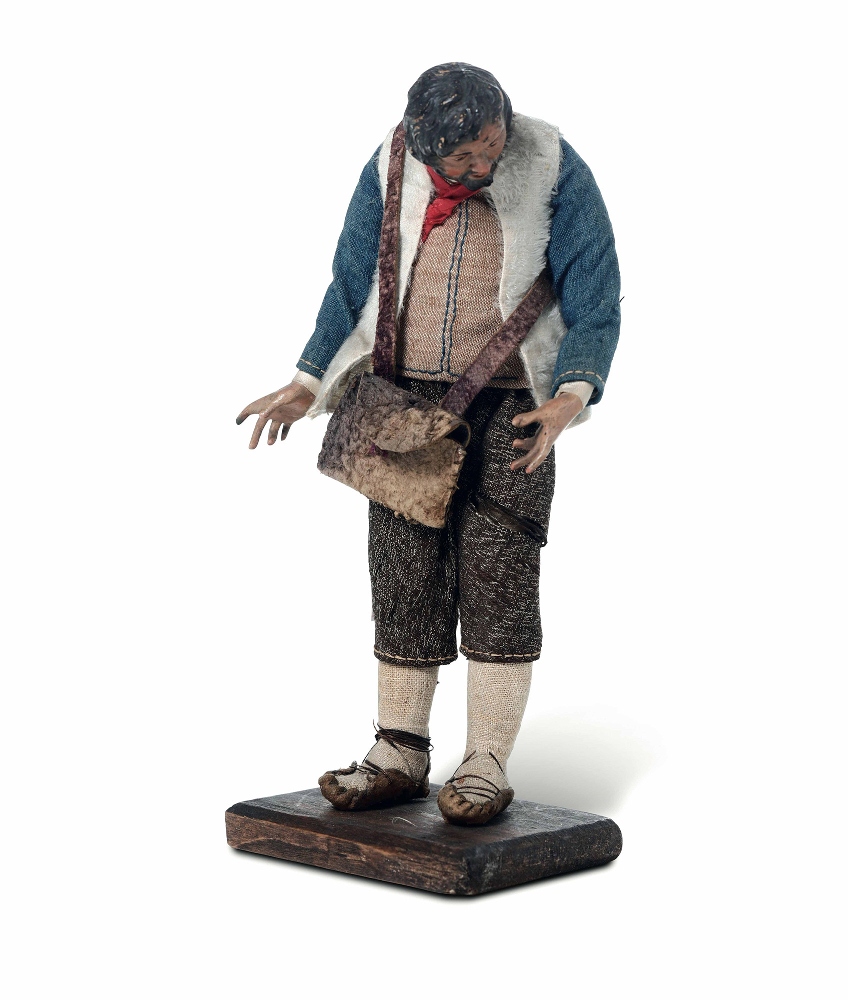 Mendicante con borsetta e giacca blu. Napoli XIX secolo, H. 20 cm