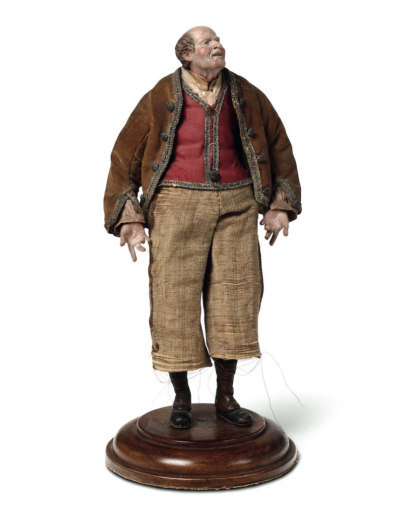 Pastore dell'annuncio con giacca marrone e pantaloni beige, Napoli XIX secolo, manichino in legno snodato, mani e testa in terracotta, H. 25 cm