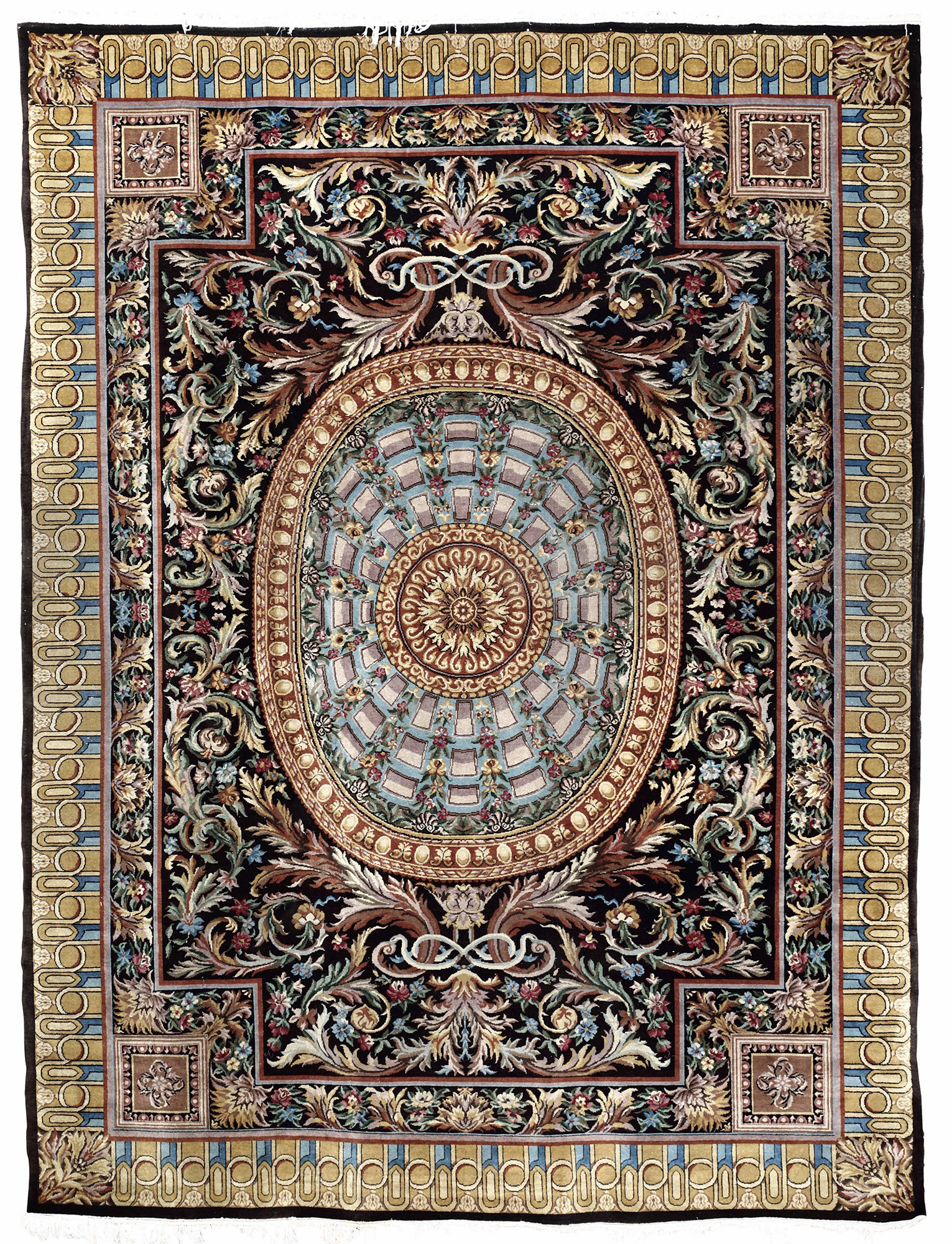 Savonnerie XX secolo, fondo marrone, campo con grande medaglione centrale, W. 456 - D. 353 cm