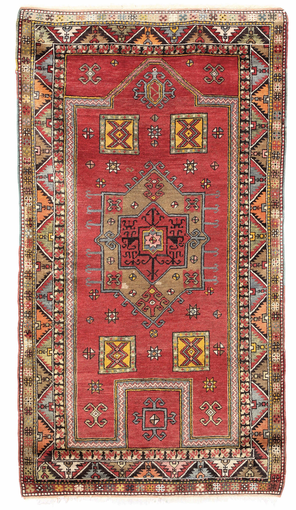 Tappeto Caucaso inizio XX secolo, campo a preghiera nicchia rossa con piccolo medaglione beige, bordura a fiori e foglie, W. 200 - D. 122 cm, Buone condizioni