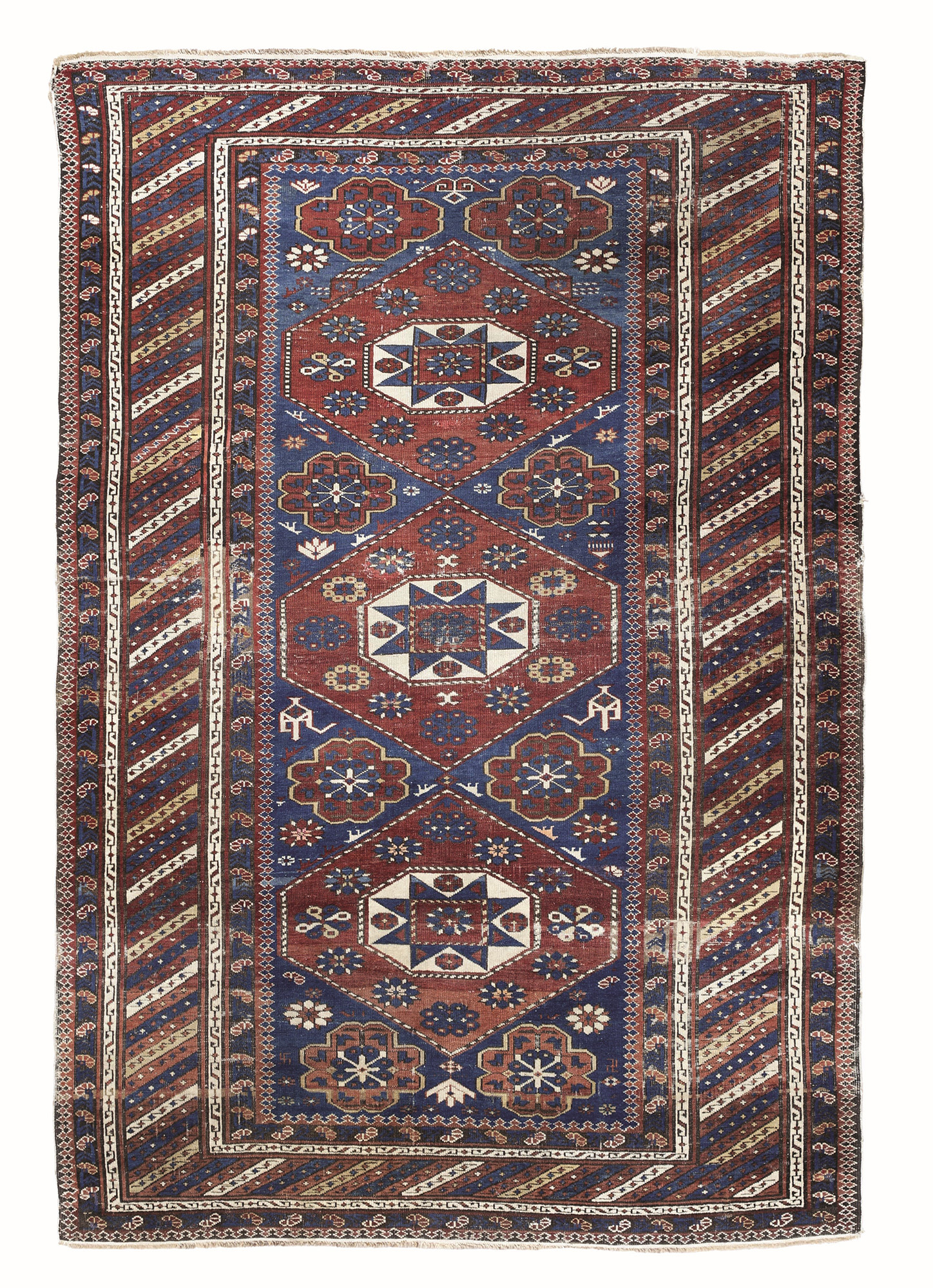 Tappeto Shirvan, Caucaso fine XIX secolo, campo blu con tre medaglioni rossi, bella la bordura a barrette diagonali, W. 197 - D. 136 cm