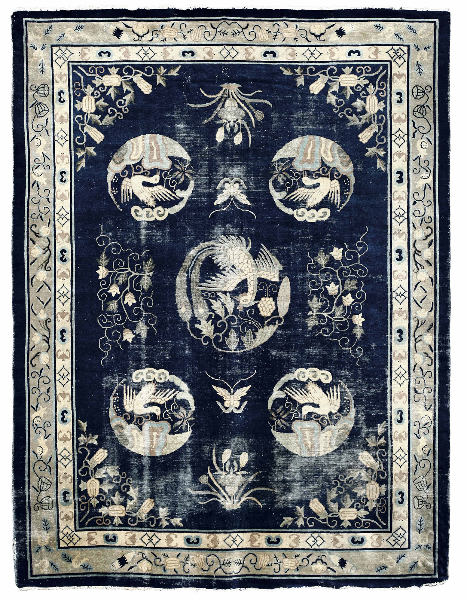Tappeto Pechino, Cina fine XIX secol. Campo blu con 5 medaglioni, particolare campo blu con cinque medaglioni contenenti fenici, W. 351 - D. 271 cm
