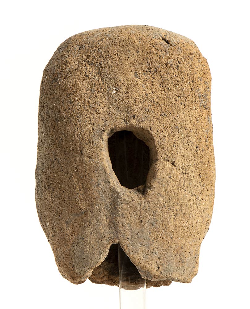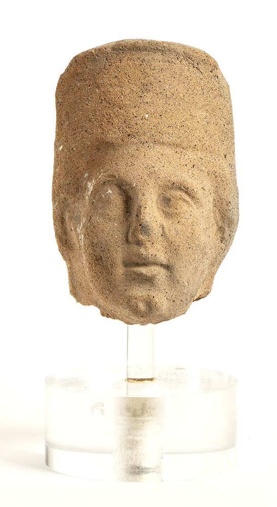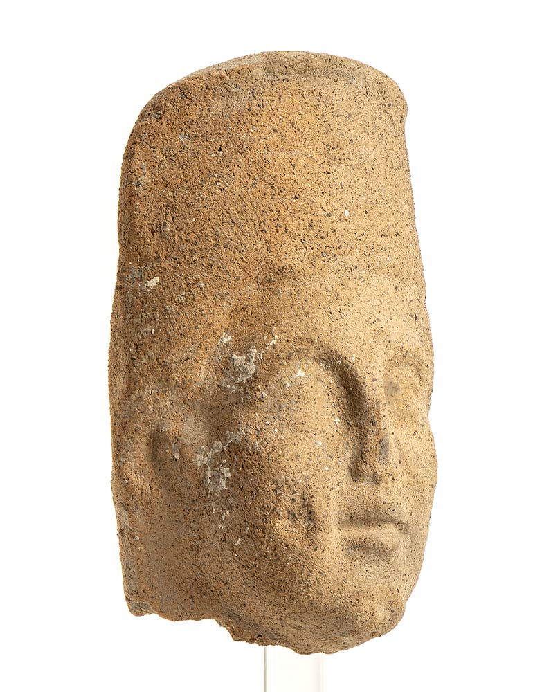Ritratto naturalistico di un'anziana signora che indossa un alto copricapo cilindrico, simile al polos. Ritratti del genere venivano donati nei santuari non solo per ricordare una persona cara recentemente perduta, ma soprattutto affinché la stessa persona dall'aldilà potesse agire da tramite con la divinità. Foro di cottura sul retro.