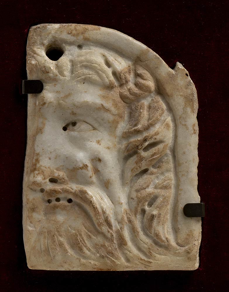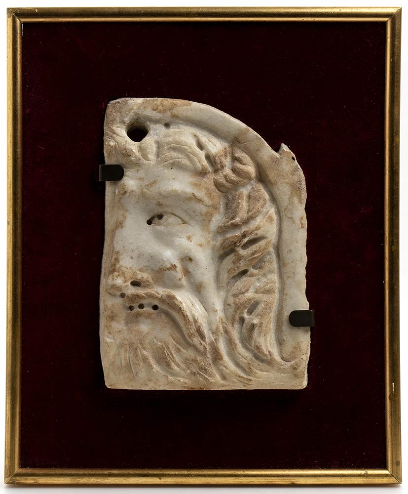 Profilo maschile barbato pertinente all’angolo superiore sinistro del coperchio di un sarcofago. Patina di vecchia collezione; montato su di un quadro con cornice dorata e fondo in velluto rosso.