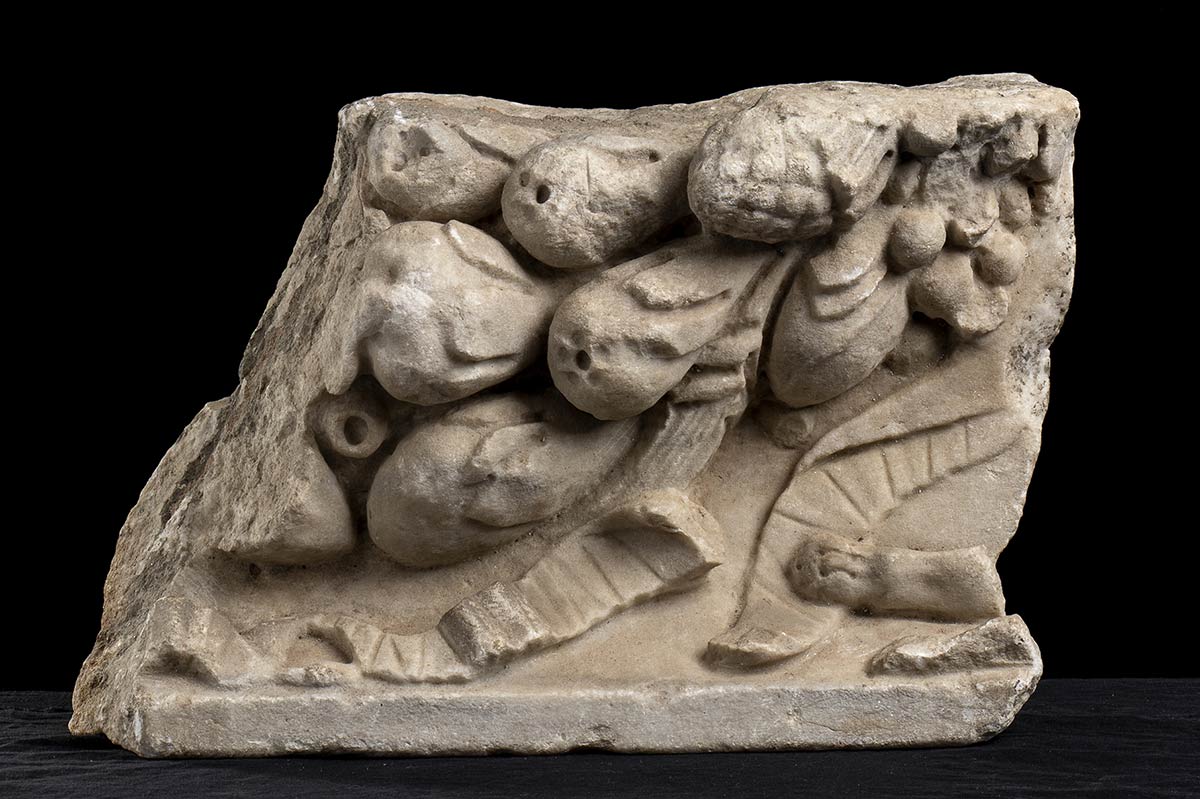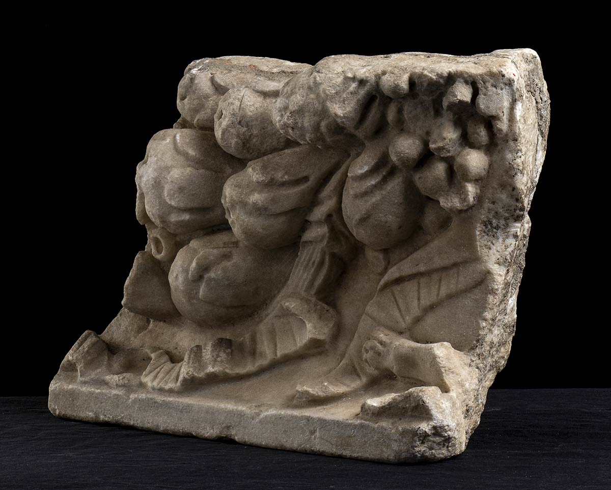 Frammento di sarcofago con ghirlanda di fiori e frutti; nell'angolo in basso a destra spunta la zampa di una pantera dionisiaca che trattiene un nastro.