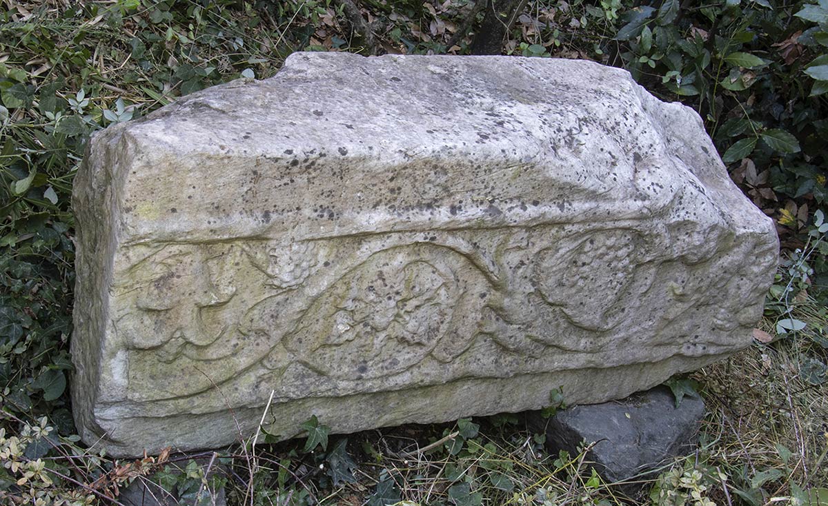 Grande e spessa lastra con girali di acanto e grappoli d’uva, originariamente concepita per esser isolata, non inserita in una trabeazione.