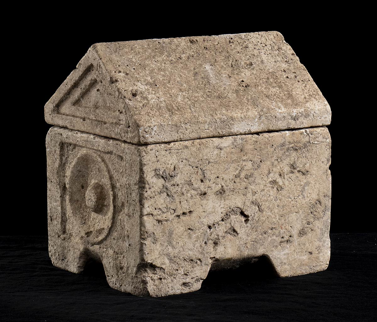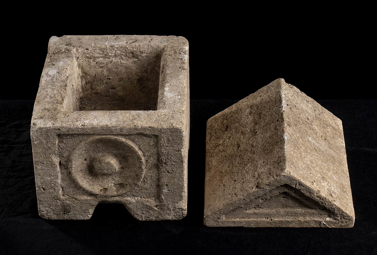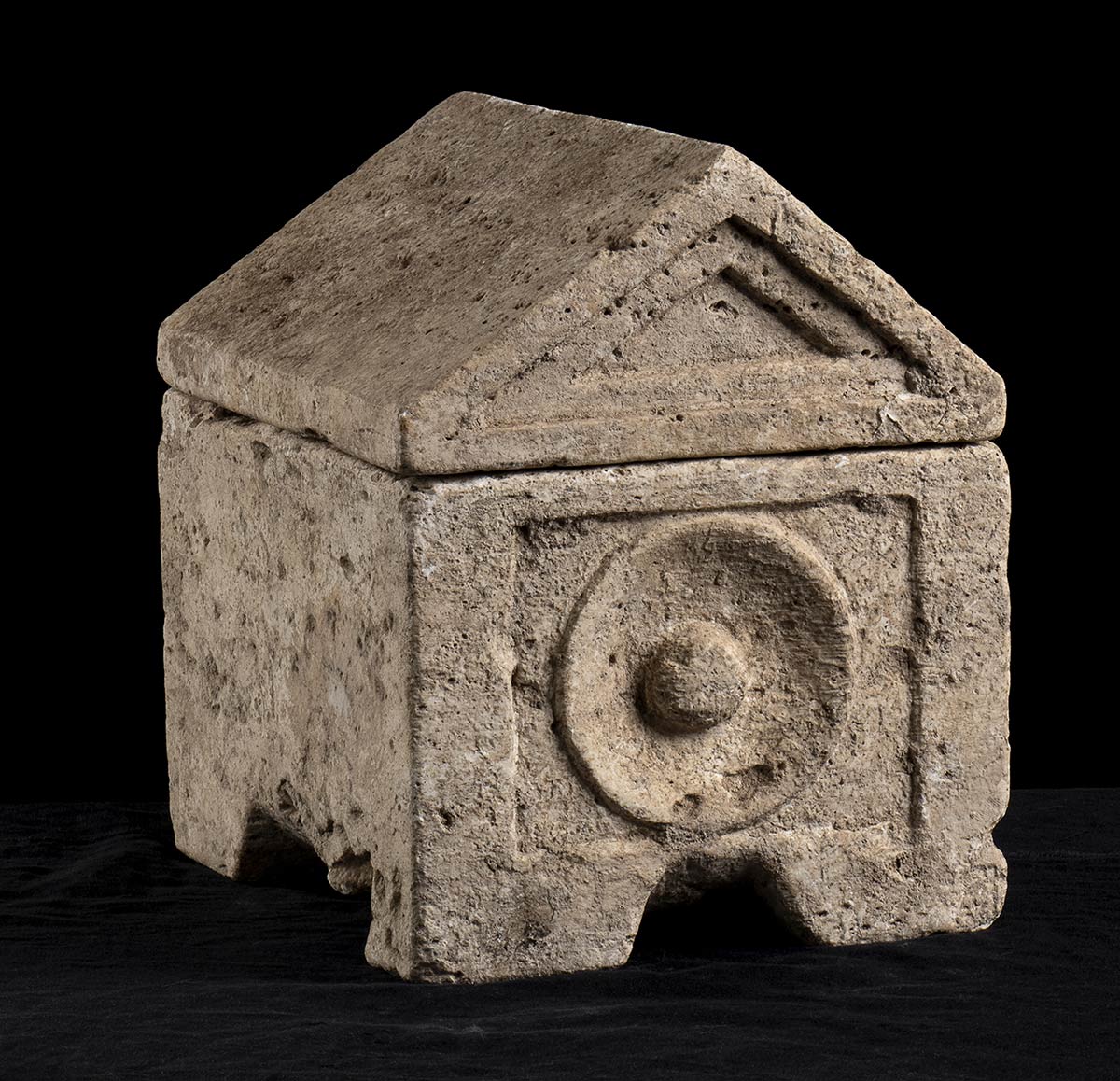 URNA CINERARIA CON COPERCHIOEpoca romanaTravertino, alt. cm 25; cassa cm 24 x...