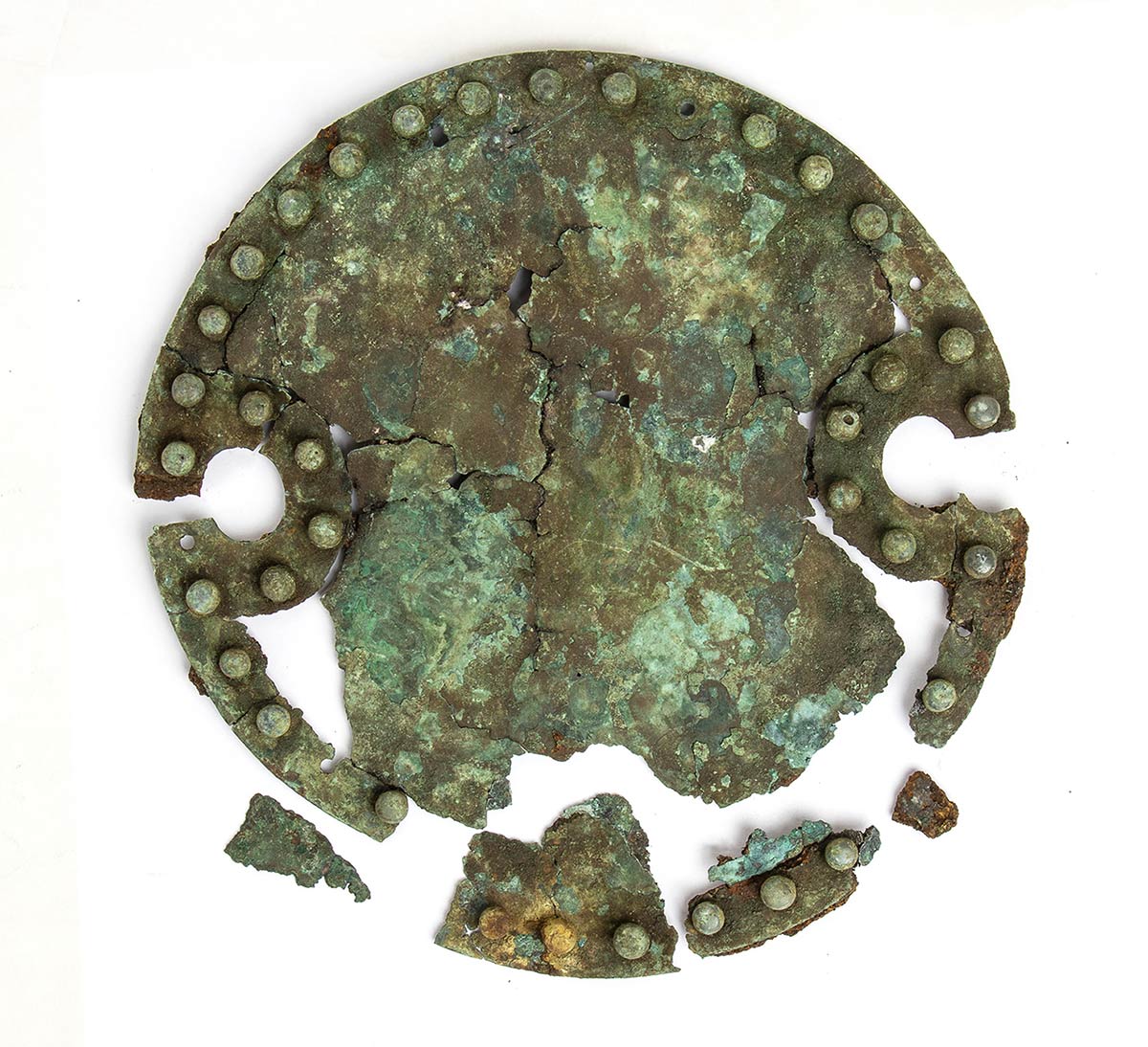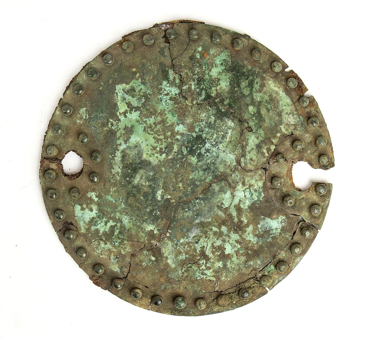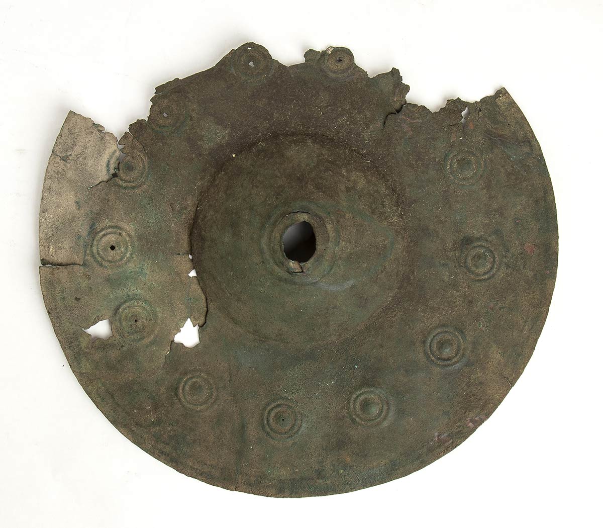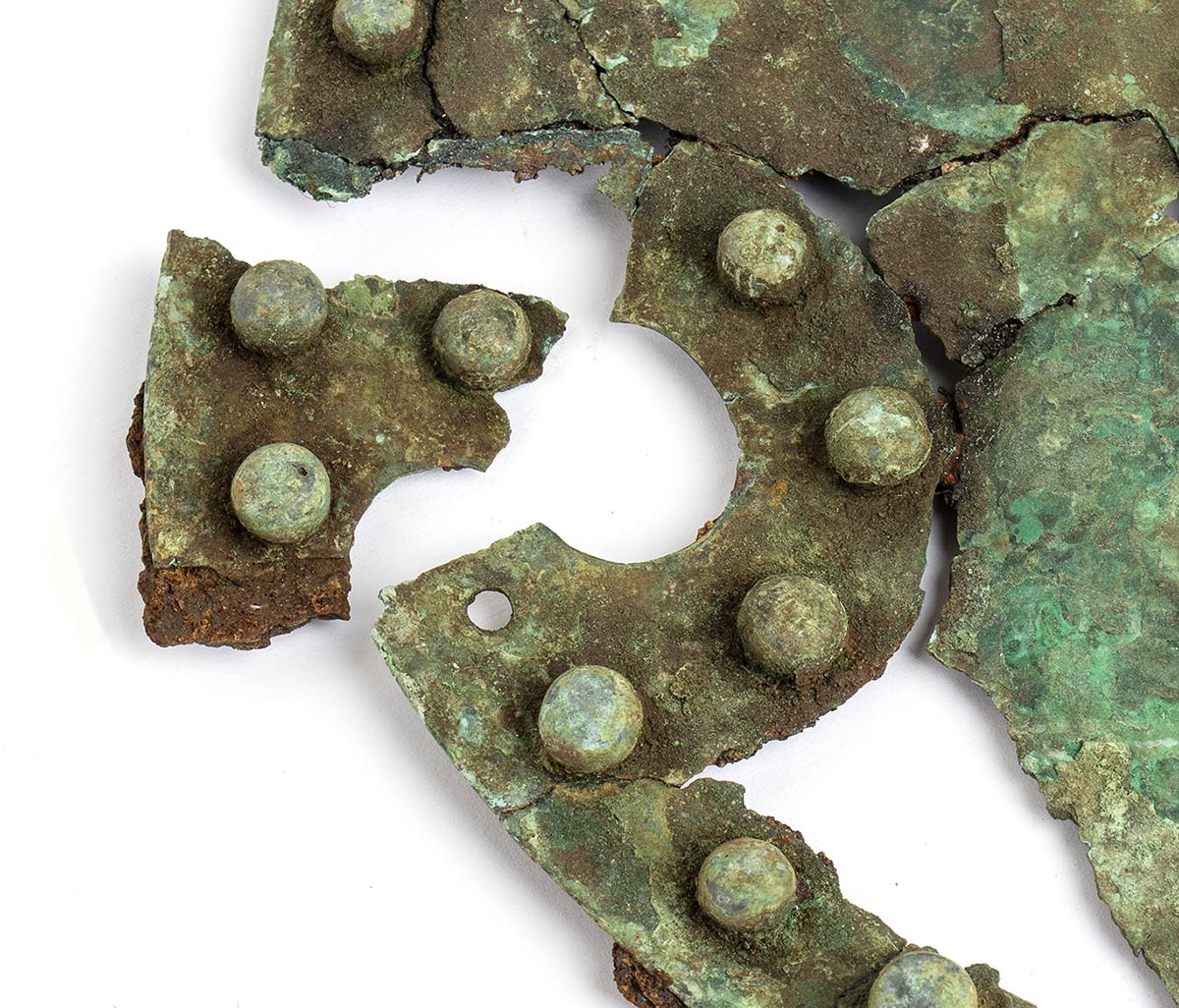 Eccezionale gruppo costituito da una coppia di dischi corazza (Kardiophylakes) e da un disco in bronzo decorato con settore centrale rilevato a cupola. I due dischi corazza, uno intergo e l'altro frammentario, lungo i margini presentano chiodi a capocchia sferica e due rientranze contrapposte a goccia. Sono ascrivibili per tipologia al gruppo "Mozzano", ed eccezionalmente conservano sul lato posteriore una cornice in ferro con adesi lembi di tessuto. Il kardiophylax era l'armatura tipica delle popolazioni italiche preromane dell'Italia centrale, diffusa in particolare tra Sanniti ed Umbri; rappresentava la protezione per il busto, una corazza rigida di piccole dimensioni di cuoio e di metallo collocata a protezione del cuore, da cui il nome. Tra le statue che raffigurano guerrieri muniti di kardiophylax, la più nota è il celebre guerriero di Capestrano.