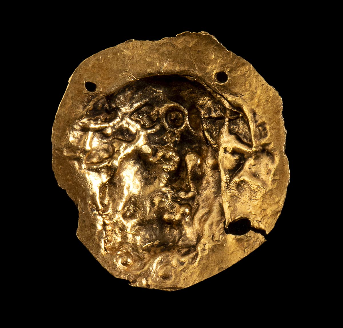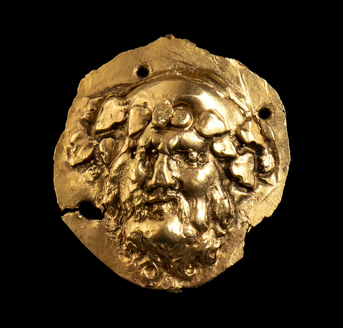 Rara applique in oro lavorata a sbalzo (repoussé), con l'immagine di un anziano sileno con lunga barba fluente bipartita e corona di foglie e frutti d'edera. Tre piccoli fori per l'affissione; saggio recente sulla fronte. Per un confronto similare vd. l'esemplare conservato al British Museum n. 1917,0601.2063.