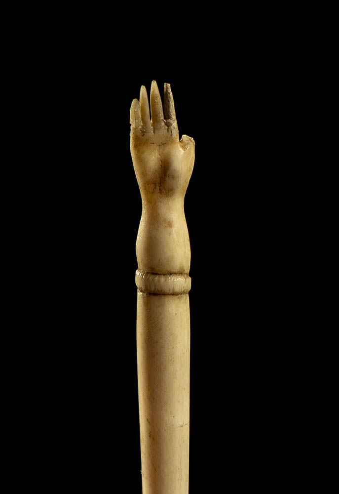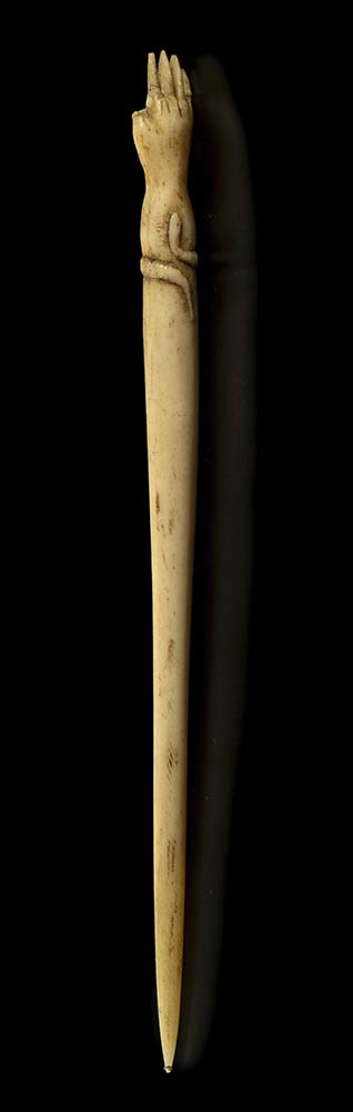 SPILLONE CON MANO E BRACCIALE A SERPENTEEpoca romanaOsso, lungh. cm 13Un dito...