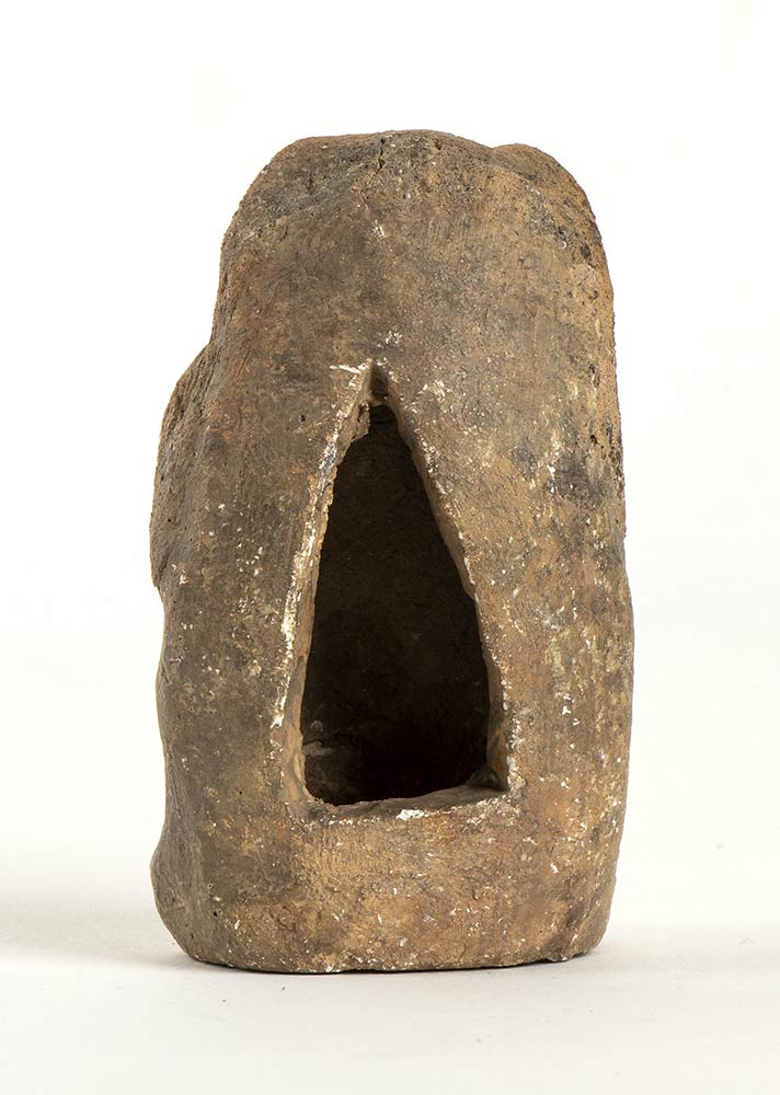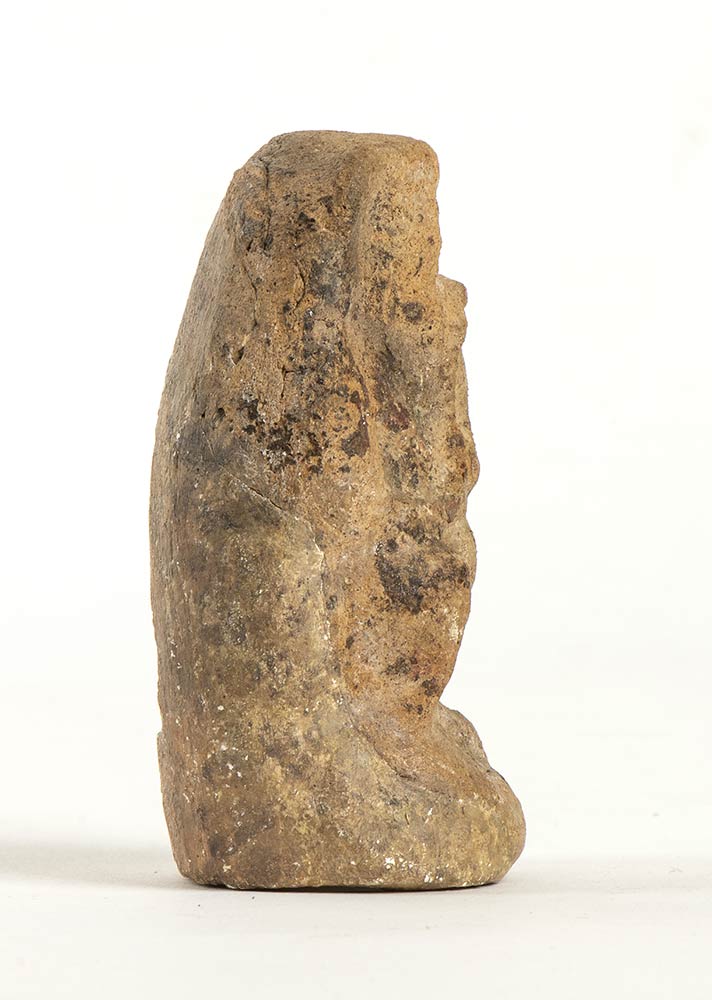 Statuetta raffigurante Bes, dio nano egizio della casa, della musica, del sonno, della fertilità e del matrimonio; guaritore e protettore dal malocchio e dalle forze del male. Foro triangolare di cottura sul retro.