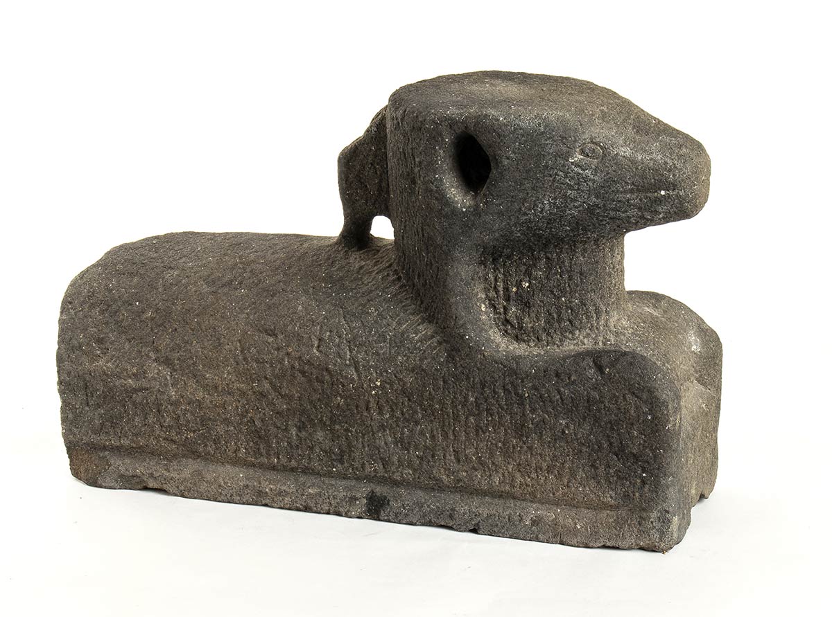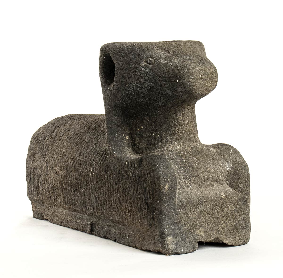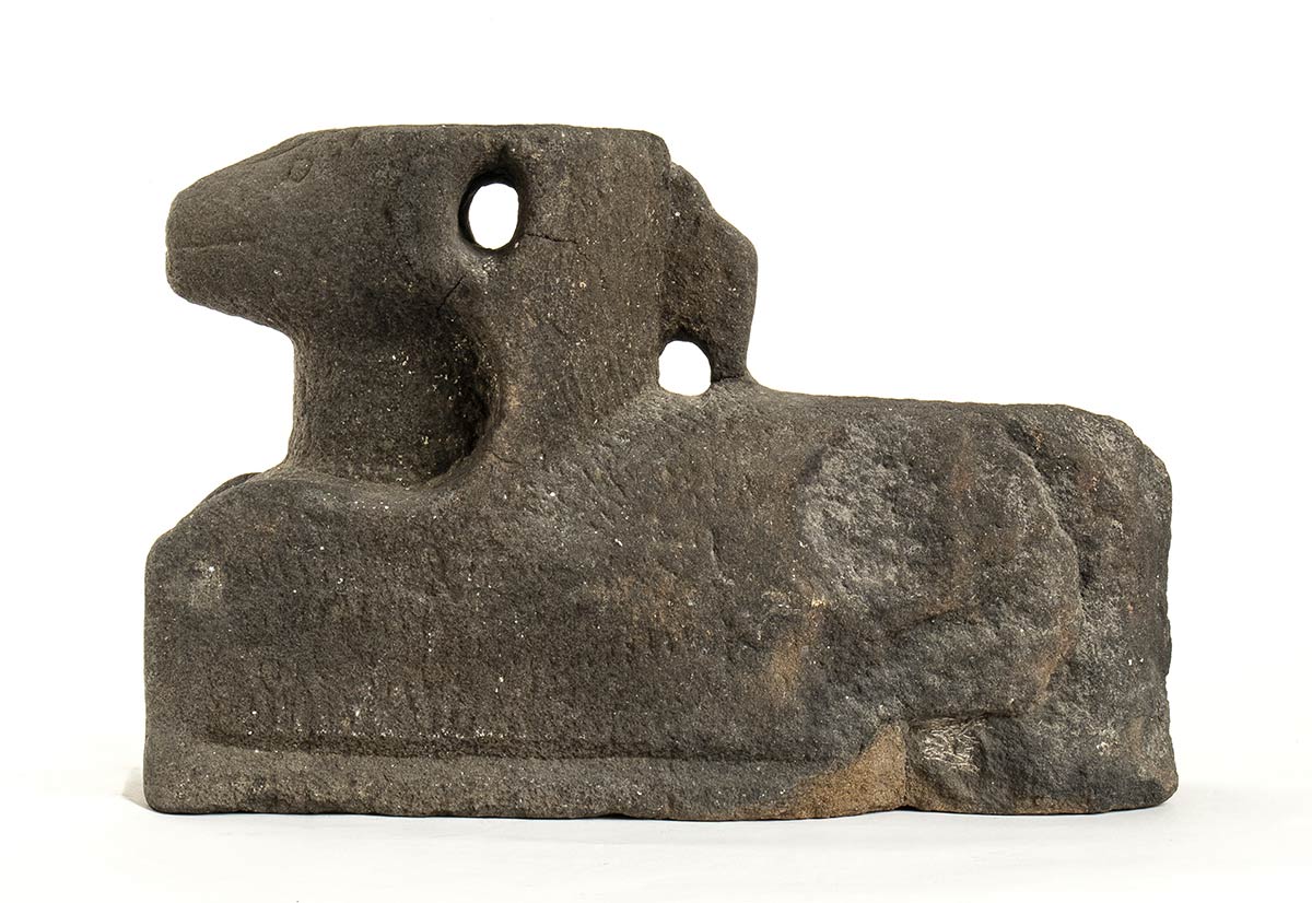Scultura in basalto scuro raffigurante un bovide in forma stilizzata, con corna originariamente mobili, oggi perdute. Il pezzo rappresenta la base di una colonnina, come parte di una scultura complessa di dimensioni maggiori, forse il bracciolo di un trono.